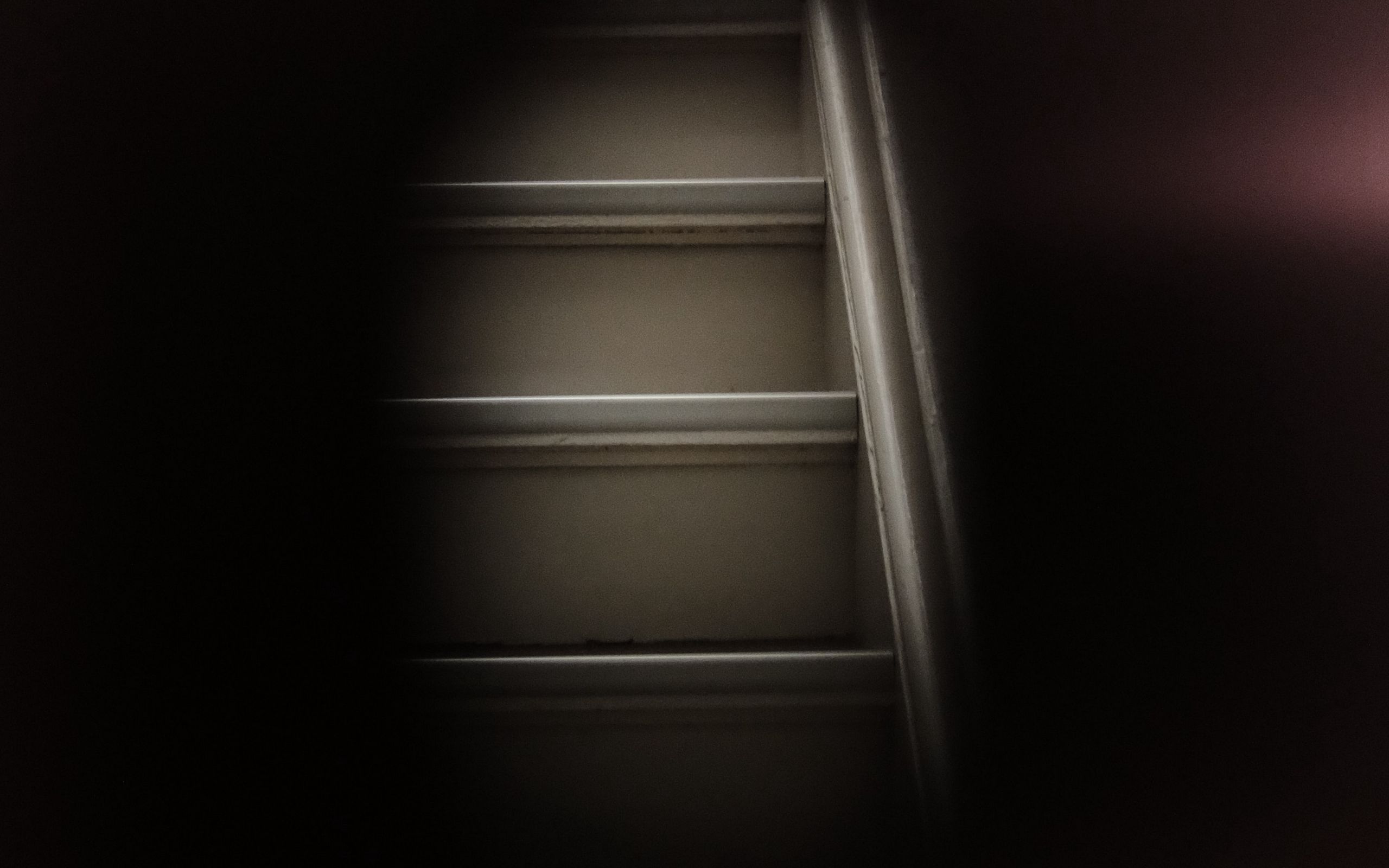 Description: A dark room with a ladder leading up to the ceiling and a light coming from the ceiling above it.