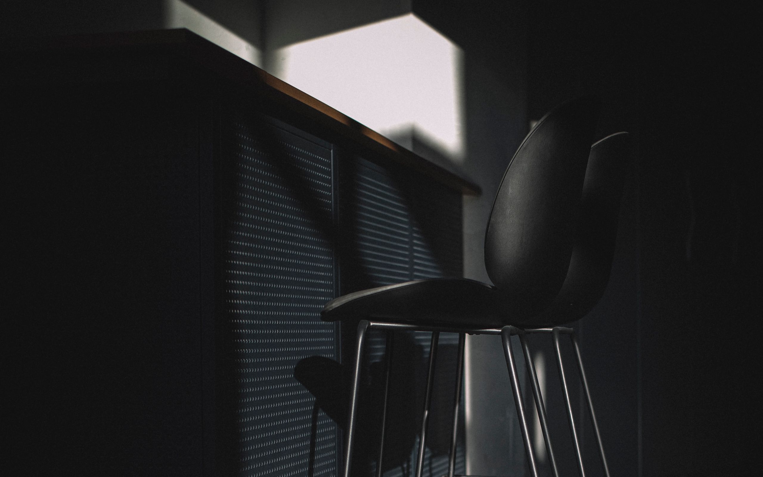 Description: A chair sitting on a metal bar stool in a dark room with a window behind it and a light coming through the window.