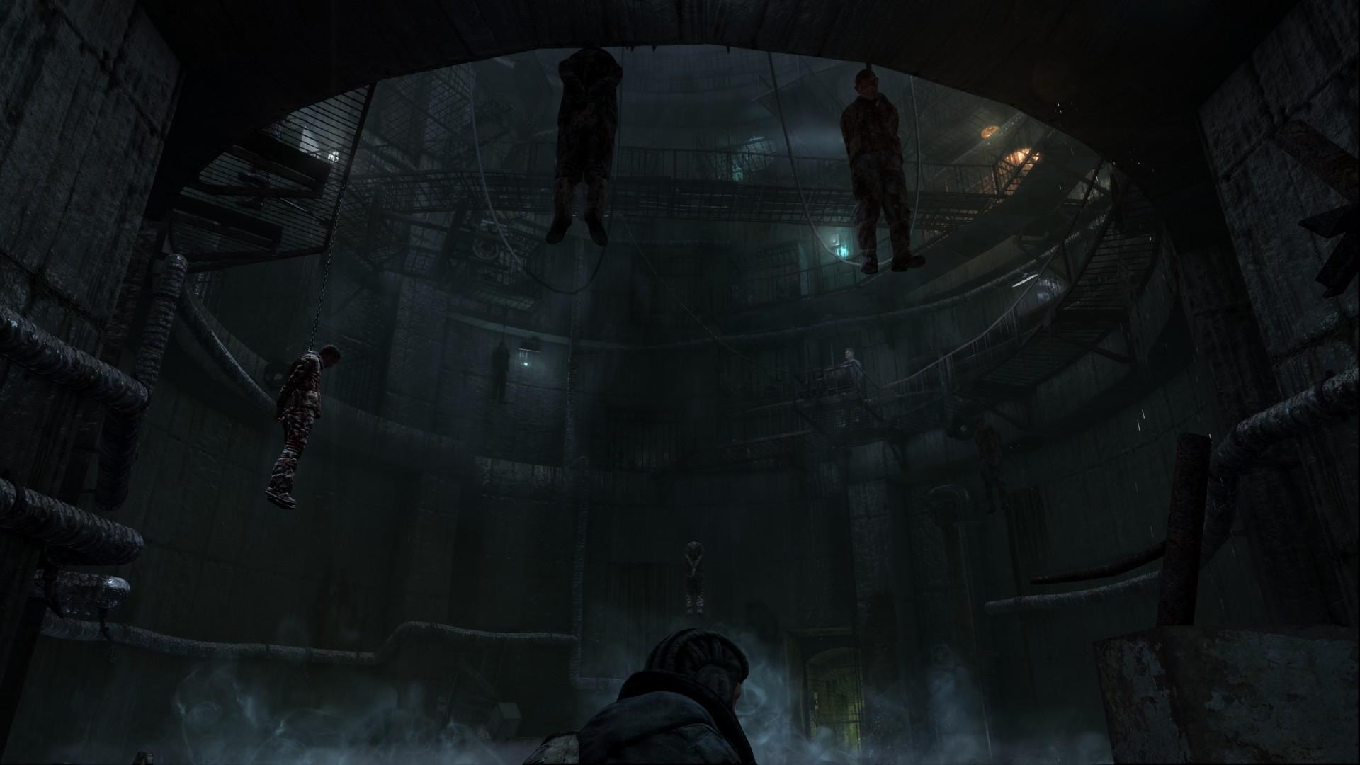 Description: A dark room with a bunch of people hanging from the ceiling and a man standing in the middle of the room.