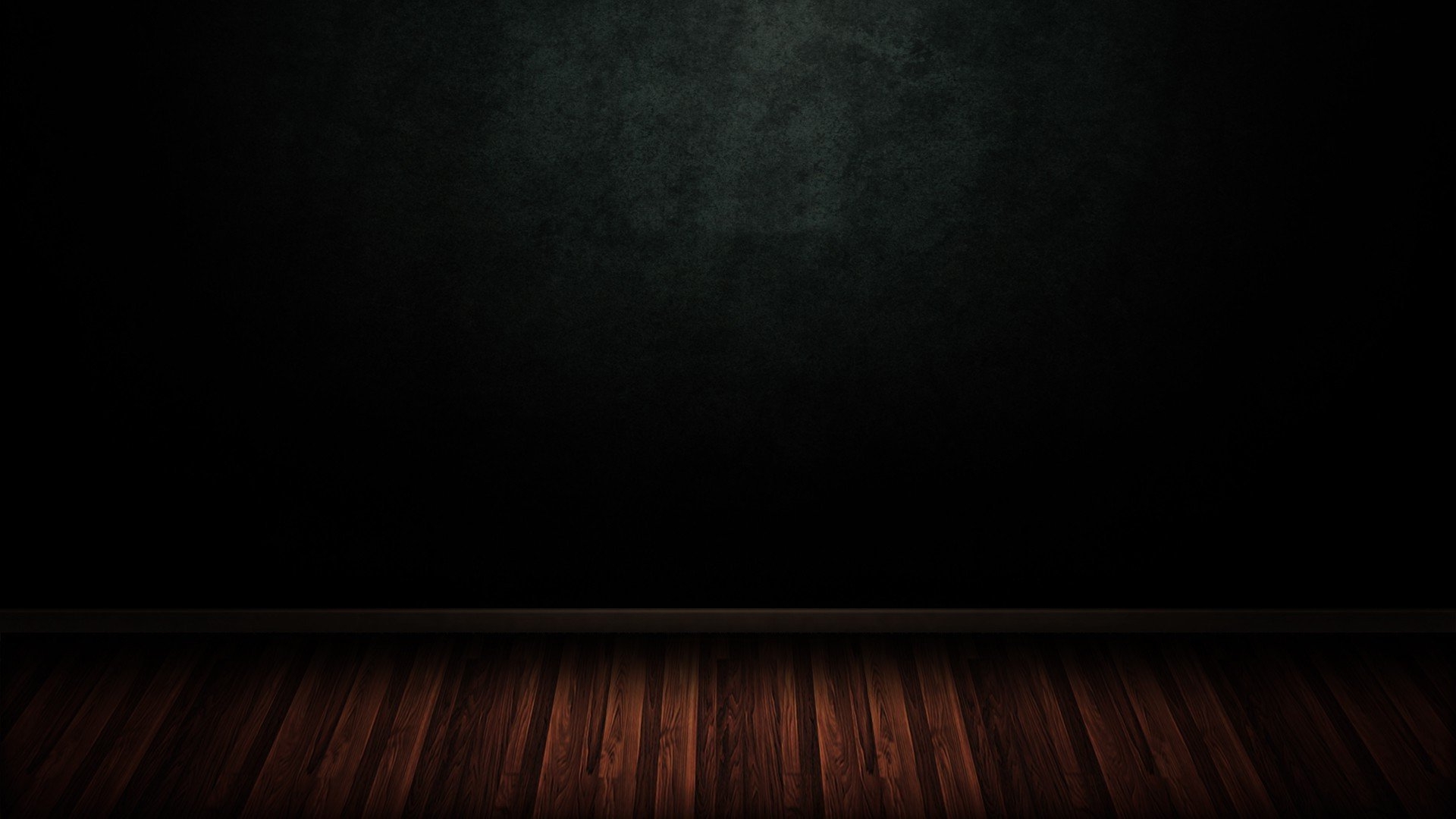 Description: A dark room with a wooden floor and a black wall with a spot light on it and a wooden floor.
