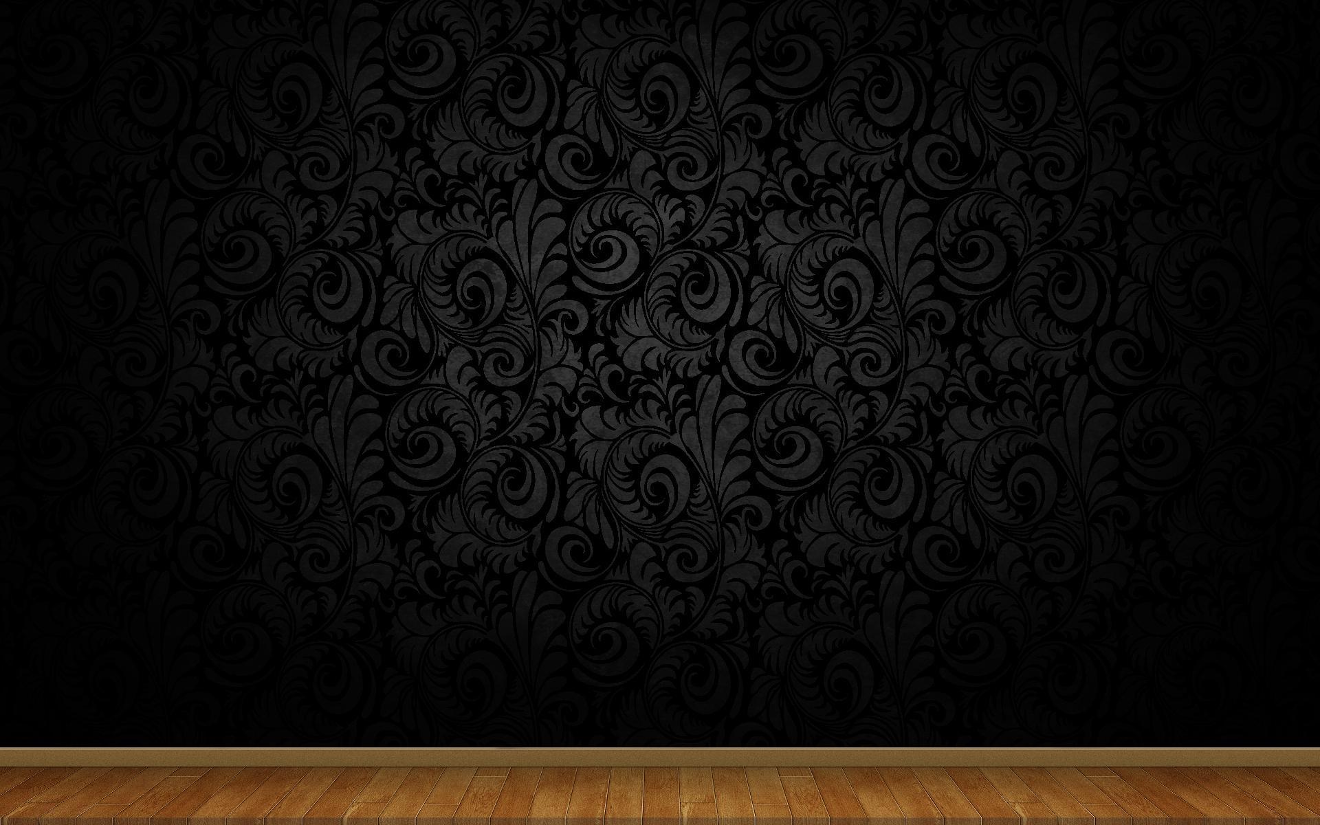 Description: A dark room with a wooden floor and a black wallpaper pattern on the wall and a wooden floor.