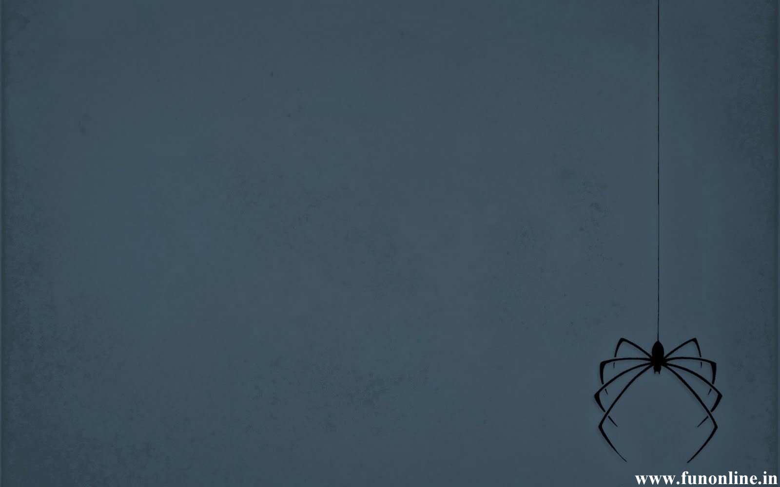 Description: A spider hanging from a wire in a dark room with a blue wall and a black spider web hanging from the ceiling.