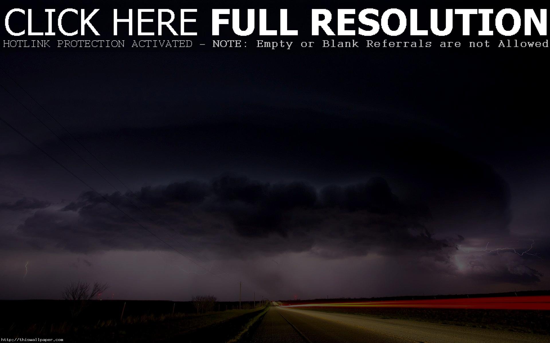 Description: A dark storm is coming down the road with a red light in the distance and a black cloud is in the sky.