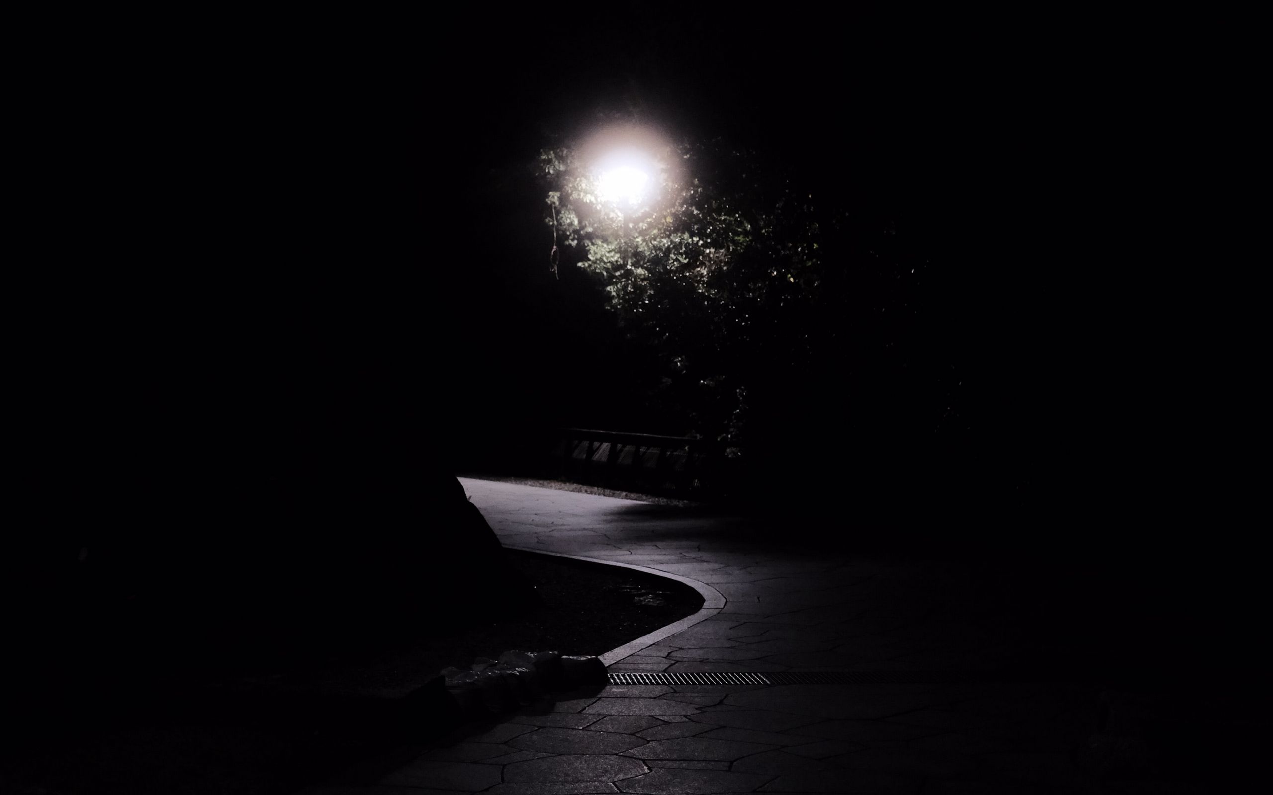 Description: A dark street with a bench and a light on it at night time with a tree in the background.