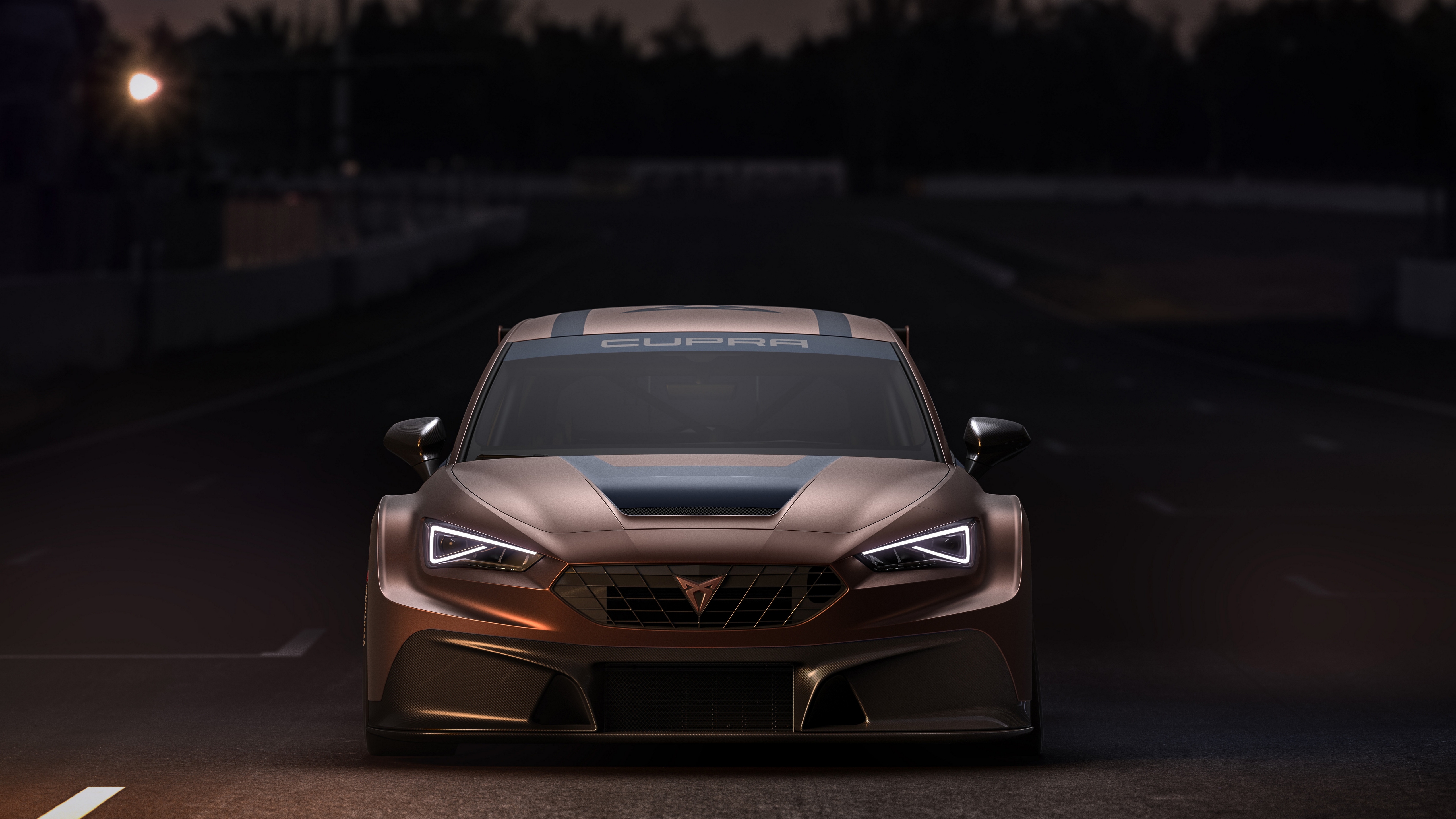 Description: A car is shown in a dark street at night with a street light in the background and a dark sky.