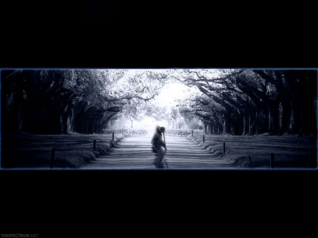 Description: A person walking down a dark street with trees on either side of them and a dark sky above them.