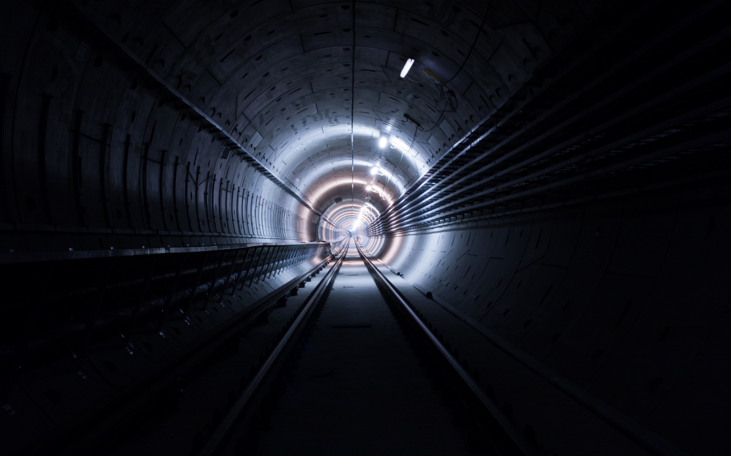 Description: A dark tunnel with a light at the end of it and a train track running through it.