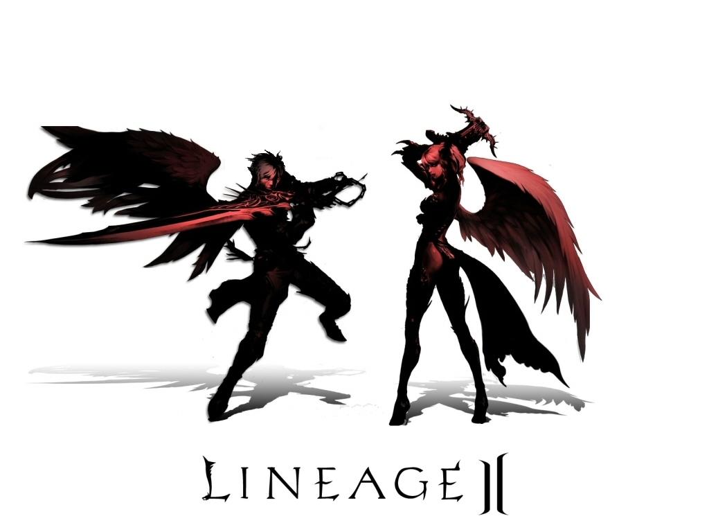 Description: Two dark colored winged women standing next to each other on a white background with the word lineage ii written below.