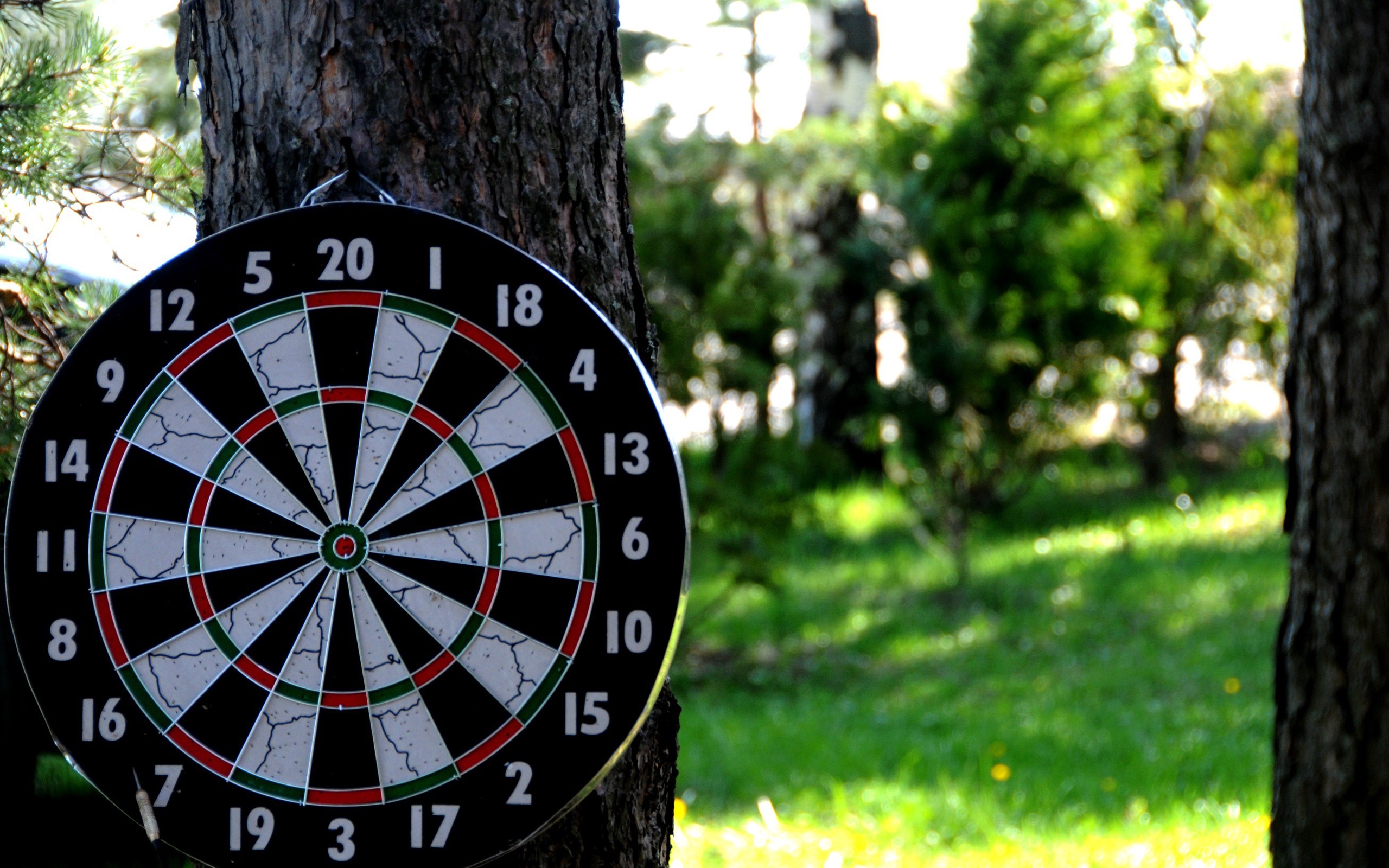 Description: A dart is stuck in a tree in a park area with grass and trees in the background.