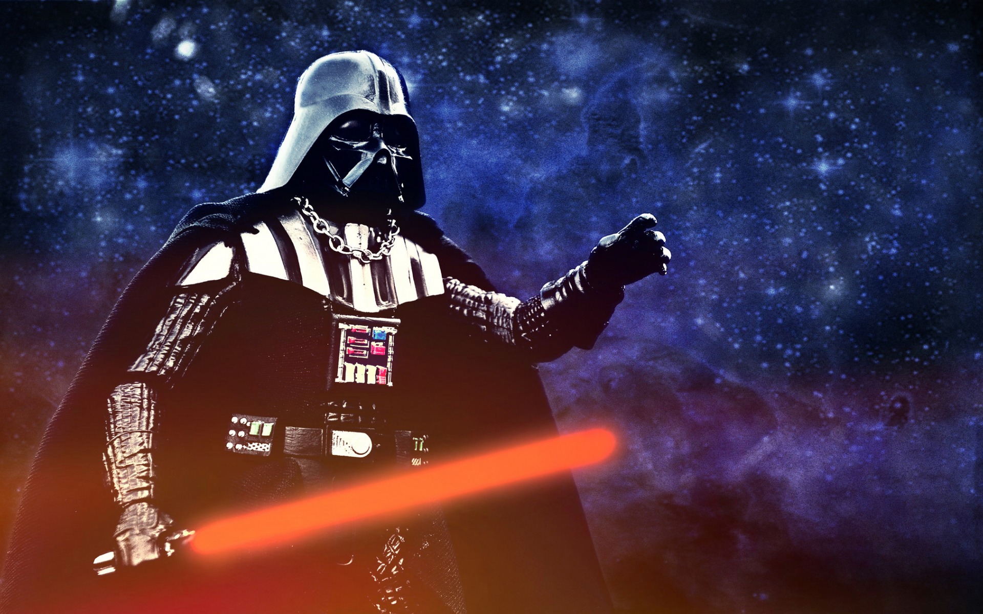Description: A darth vader standing in front of a galaxy background with stars and a red light saber in his hand.