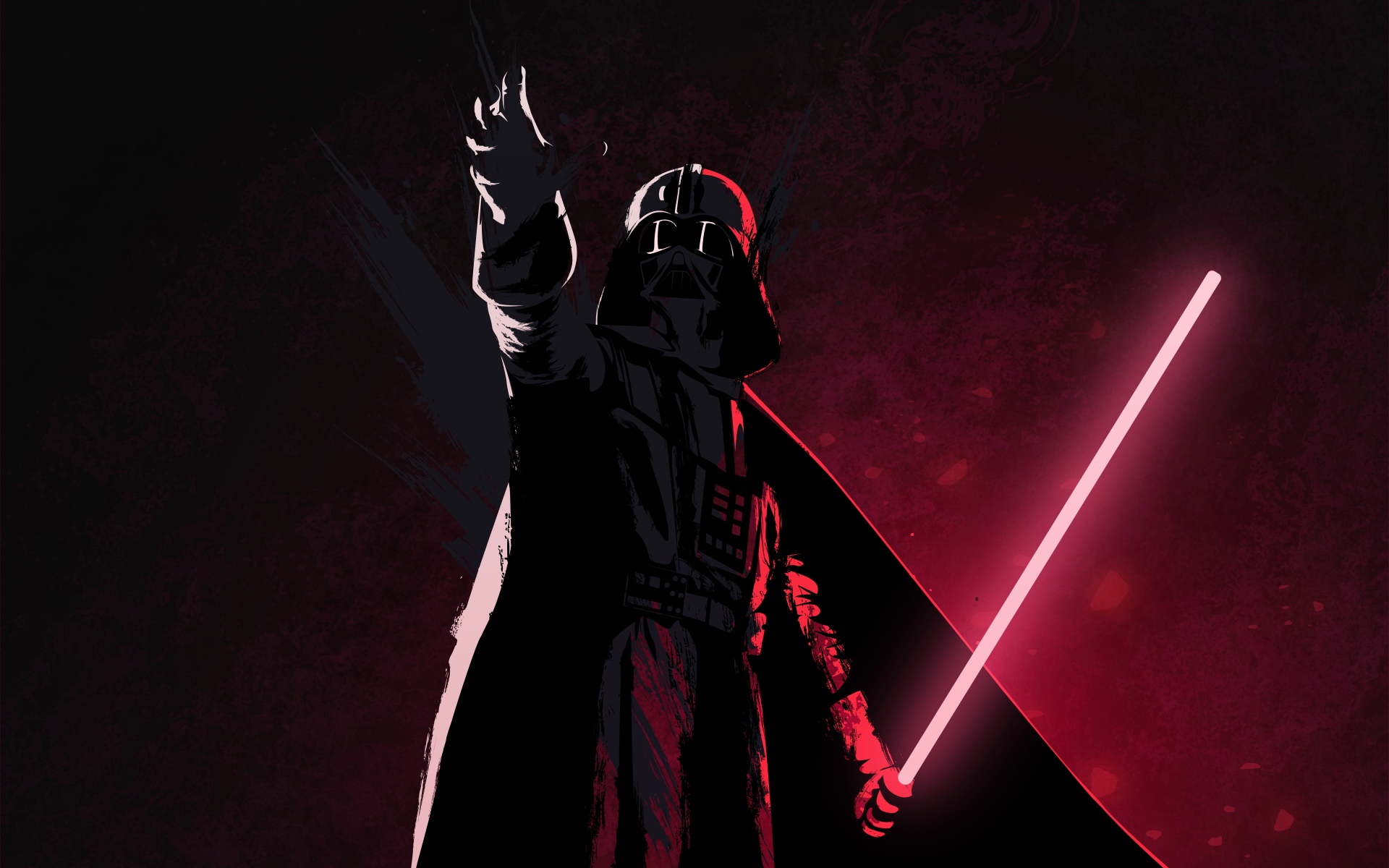 Description: A man in a darth vader costume holding a light saber in his hand and pointing at the sky.