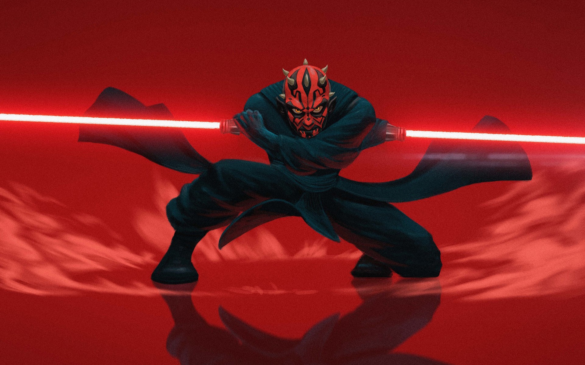 Description: A man in a darth vader costume with a red light saber in his hand and a red background.