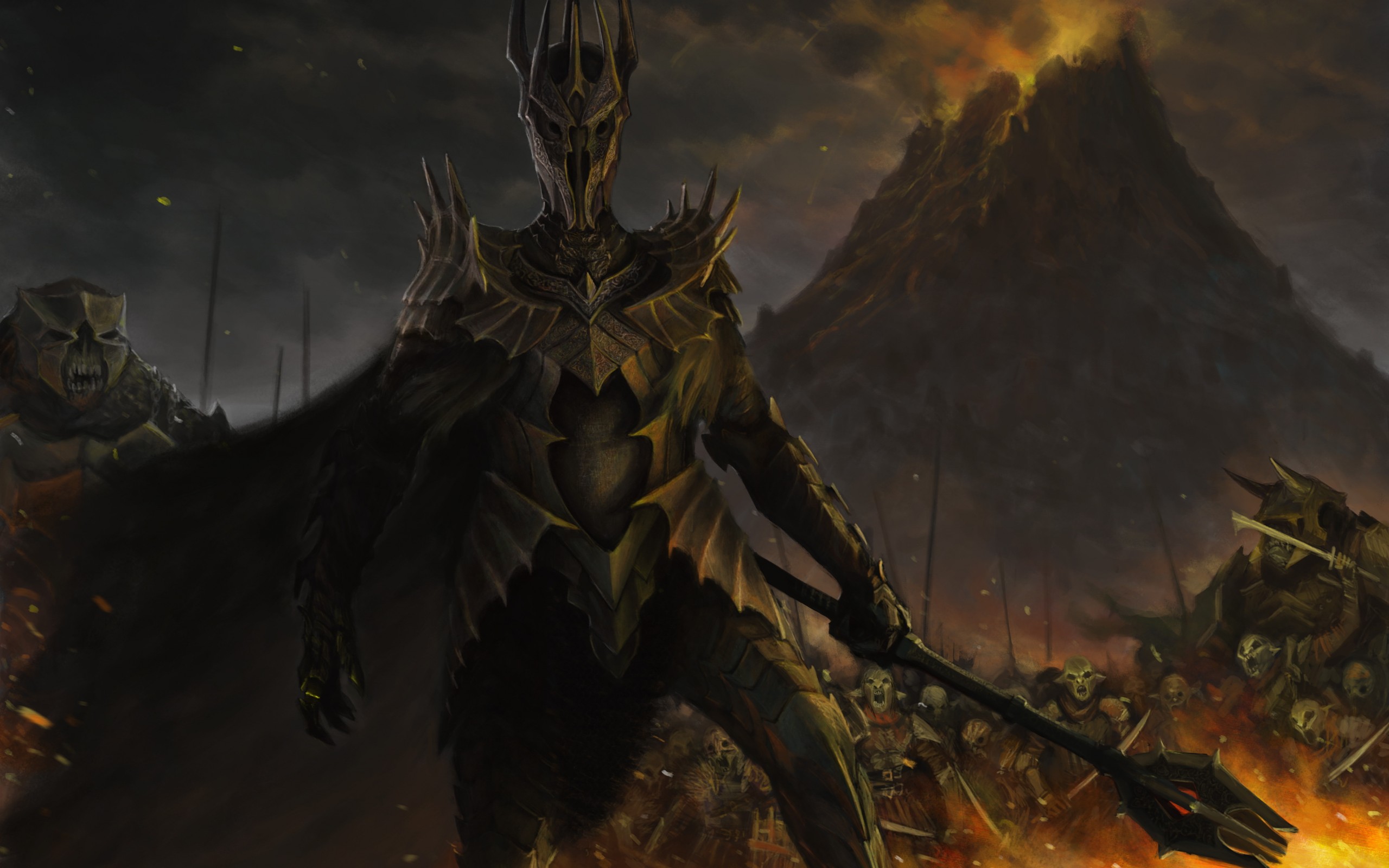 Description: A painting of a man with a sword in front of a fire filled mountain with flames and monsters on it.