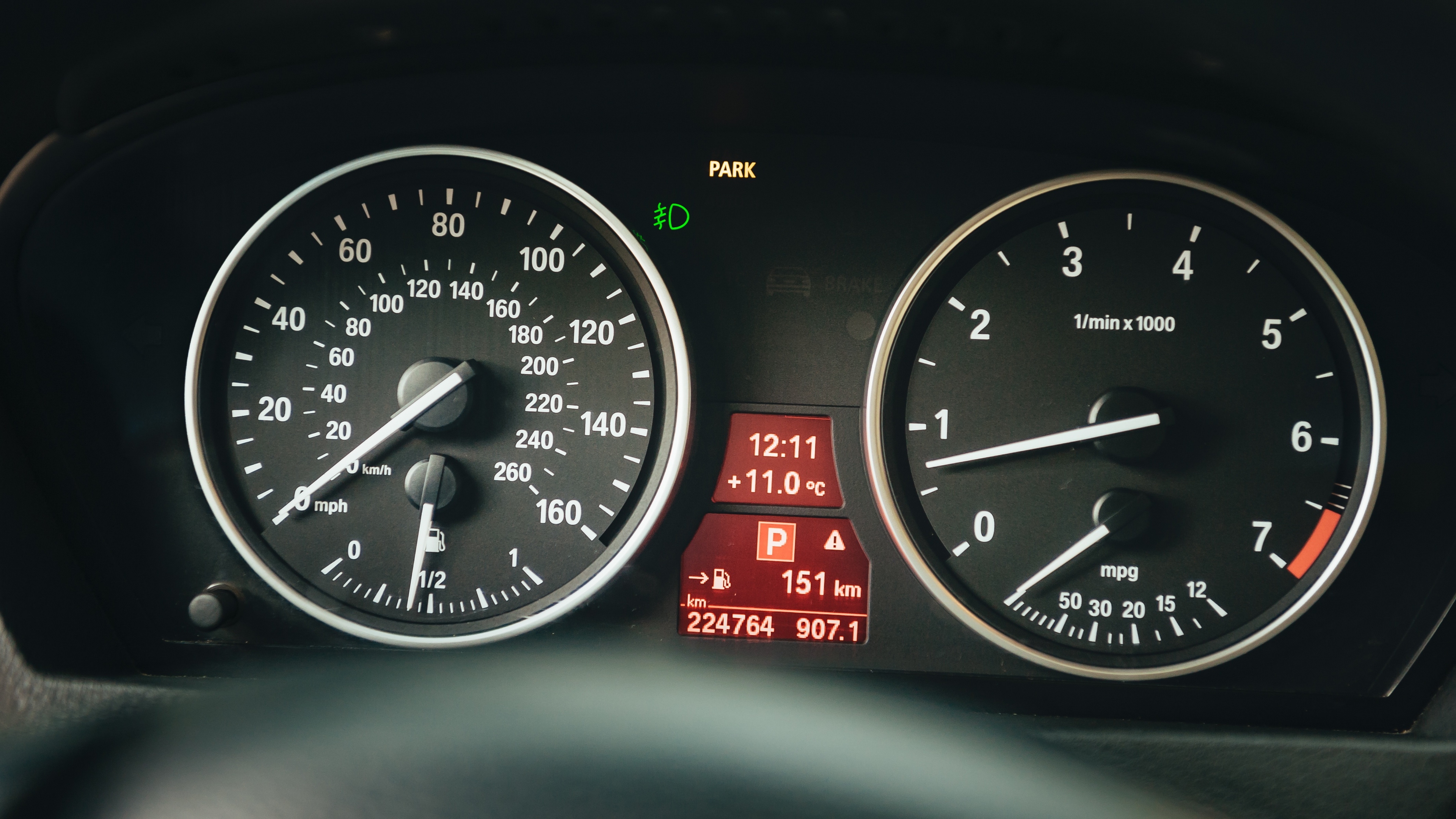Description: A close up of a speedometer and gauges in a vehicle's dashboard area with a dash light.