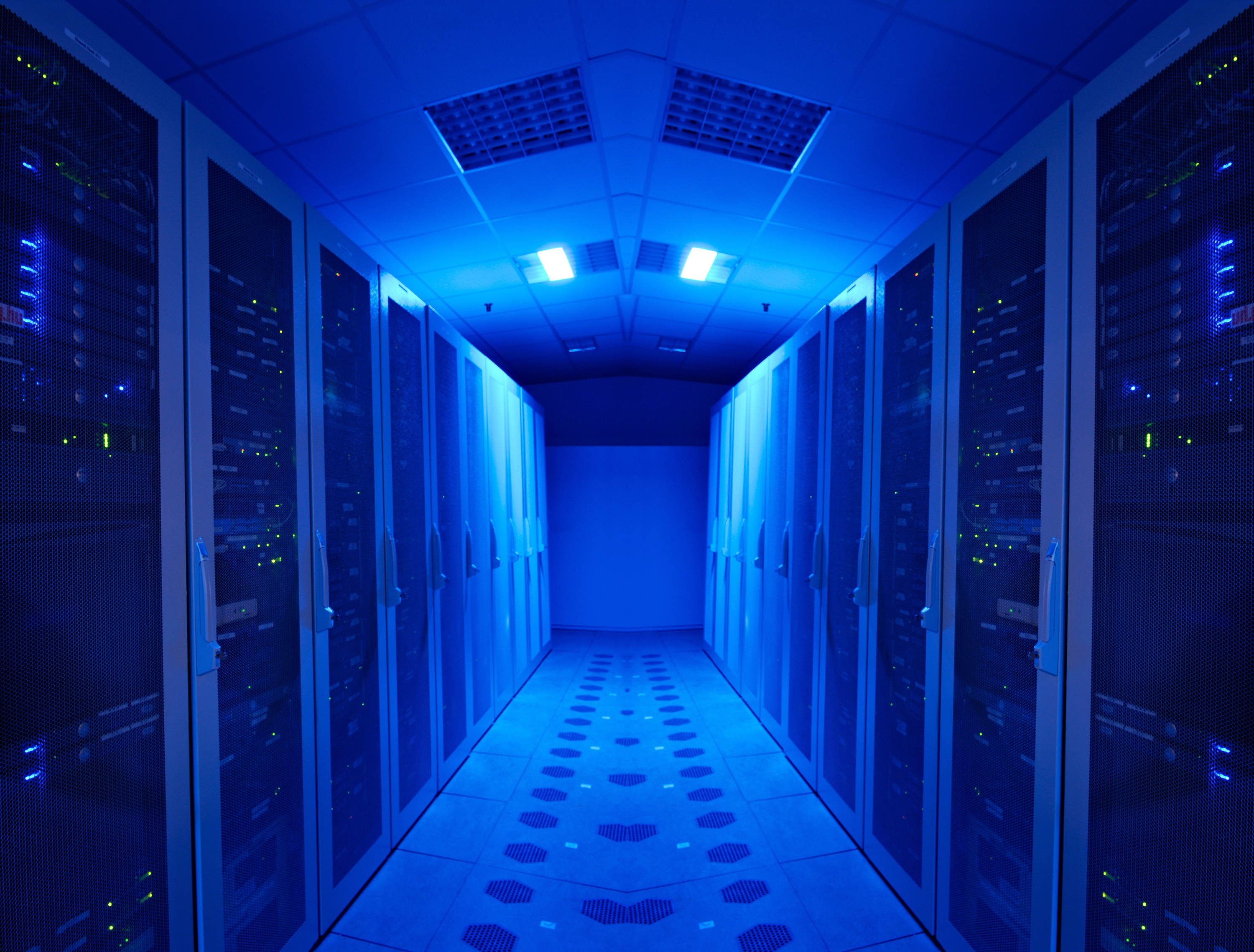 Description: A long hallway with rows of servers in a data center with blue lighting on the ceiling and flooring.