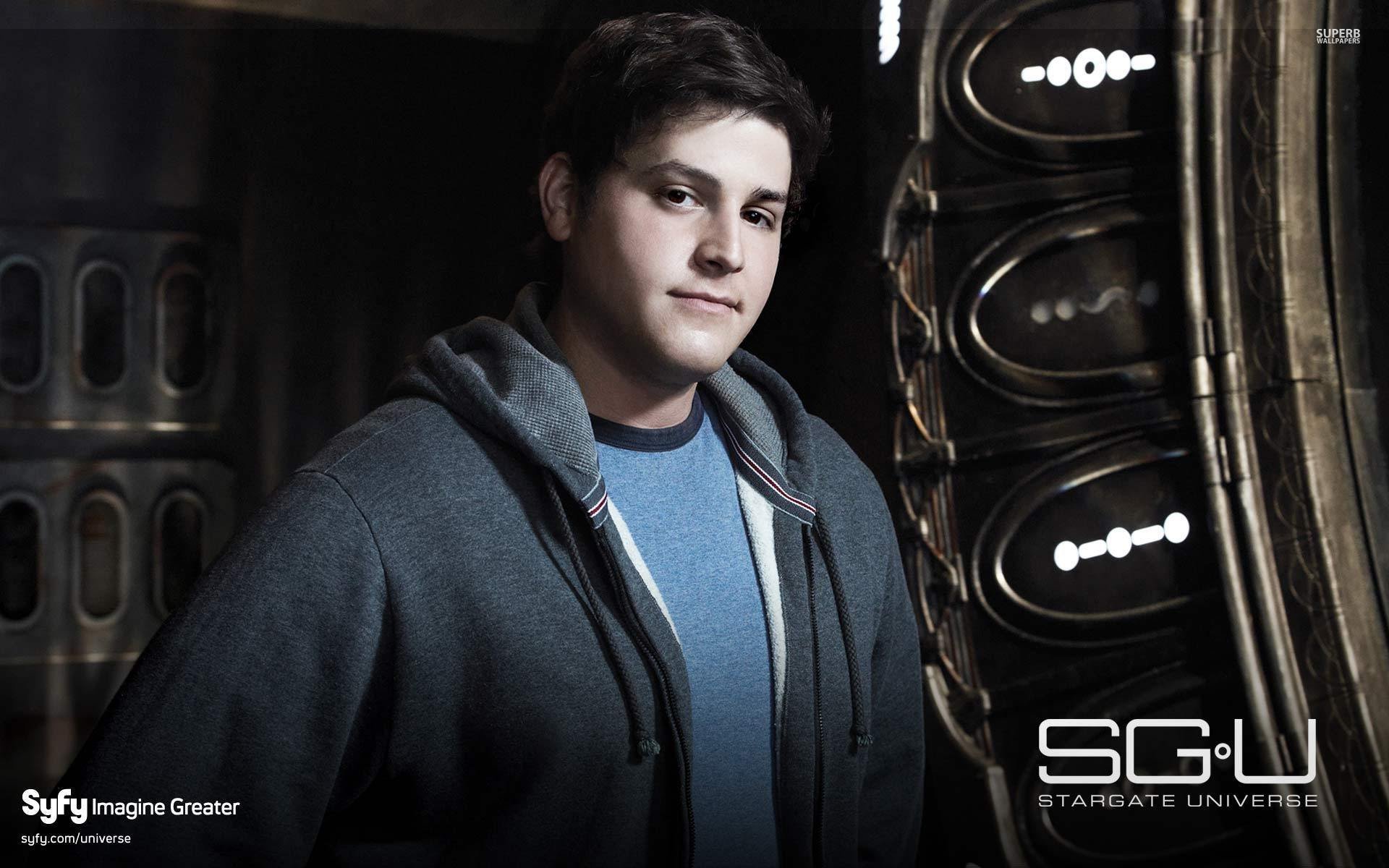 Description: A man standing in front of a wall with a clock on it's face and a name tag on it.