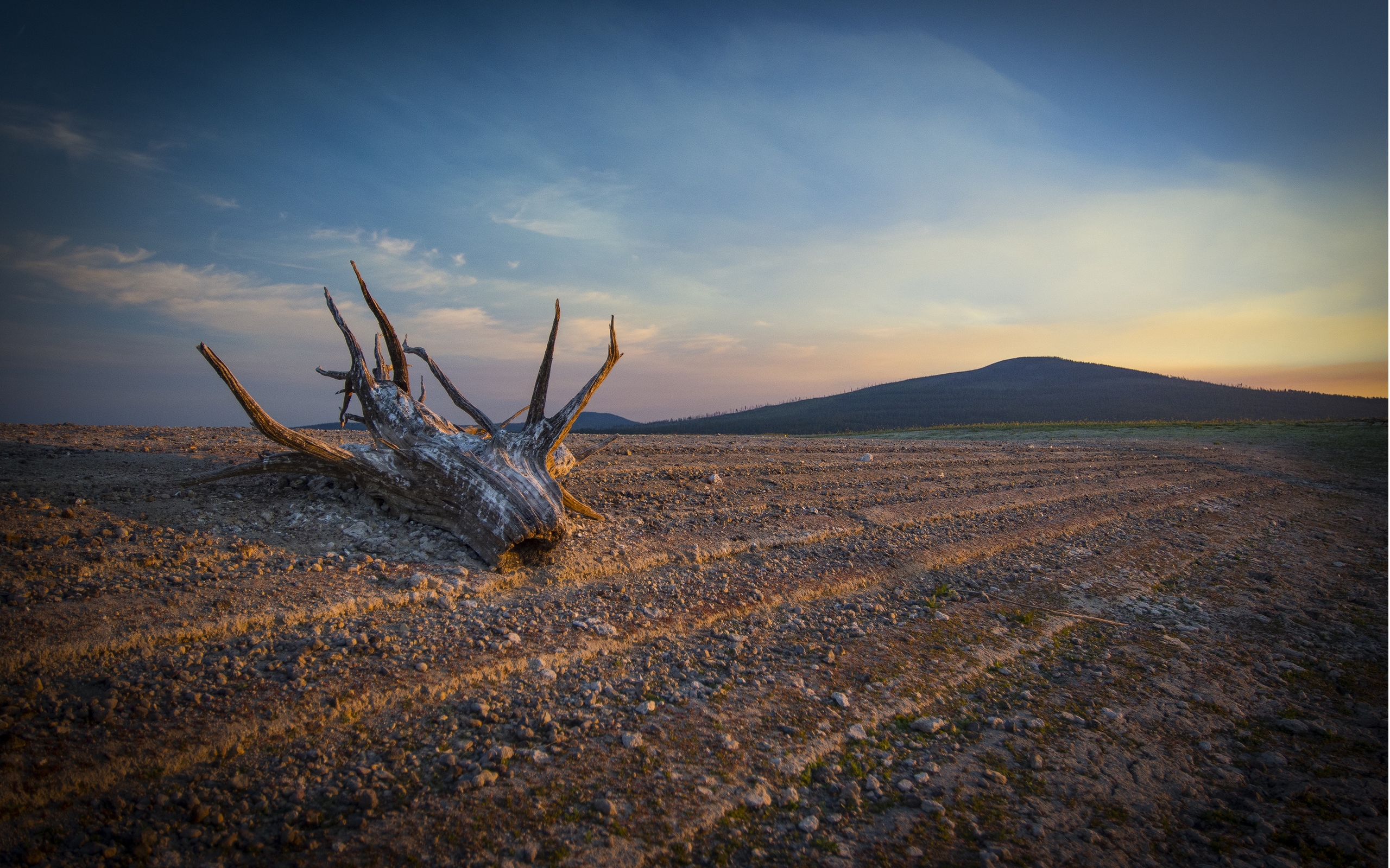 Description: A dead tree in a field with a mountain in the background at sunset or dawn with a blue sky.