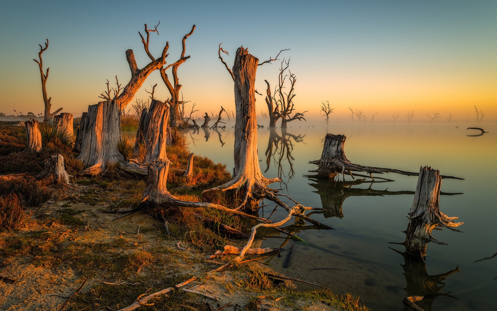 Description: A group of dead trees in the water at sunset or dawn with a fog in the sky and a few dead trees in the water.