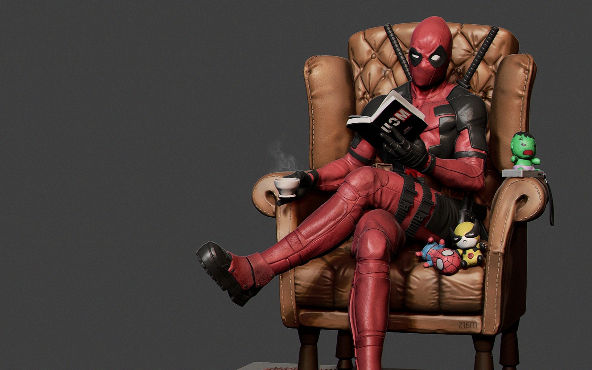 Description: A deadpool character sitting in a chair reading a book with a toy on the arm of it and a green toy.