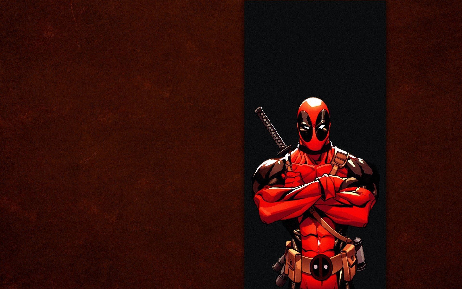 Description: A deadpool character is standing in a doorway with a sword in his hands and a knife in his other hand.