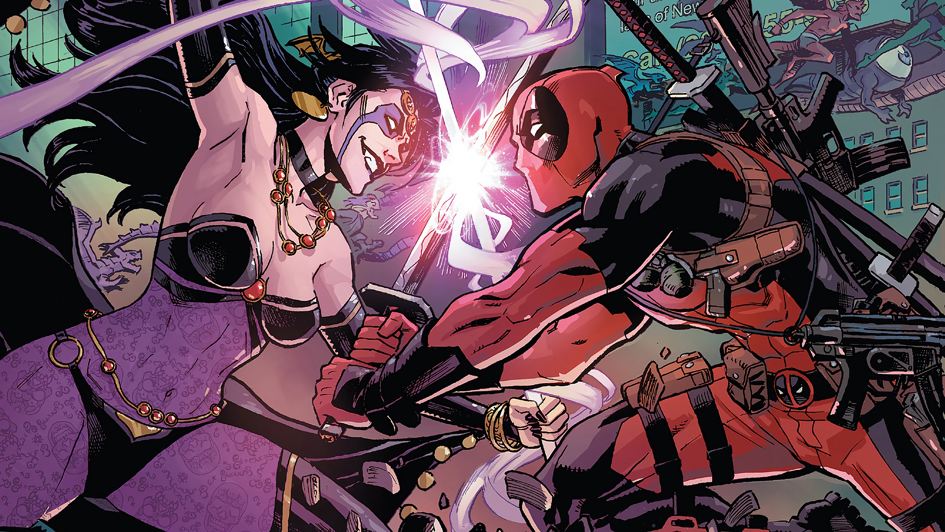 Description: A group of deadpools fighting in a cartoon style scene with a gun in the air and a woman in a red costume.
