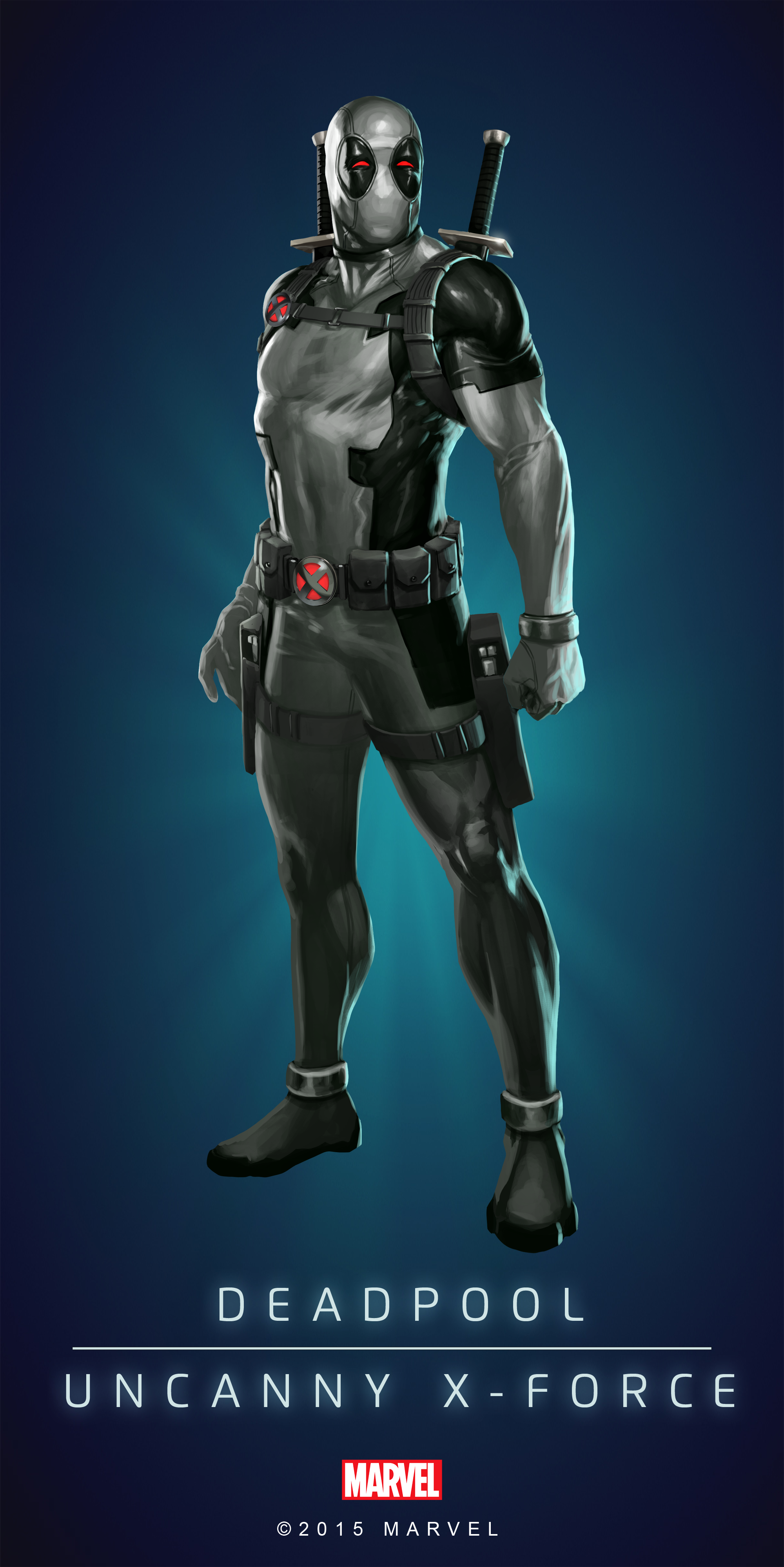 Description: A poster of a deadpool character in a suit and helmet with a sword in his hand.