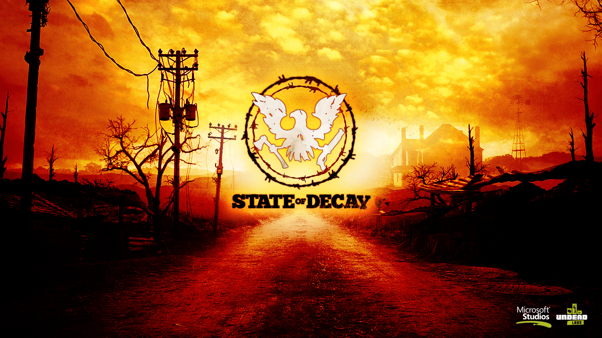 Description: A picture of a state of decay sign on a road with a sunset in the background and a red sky.