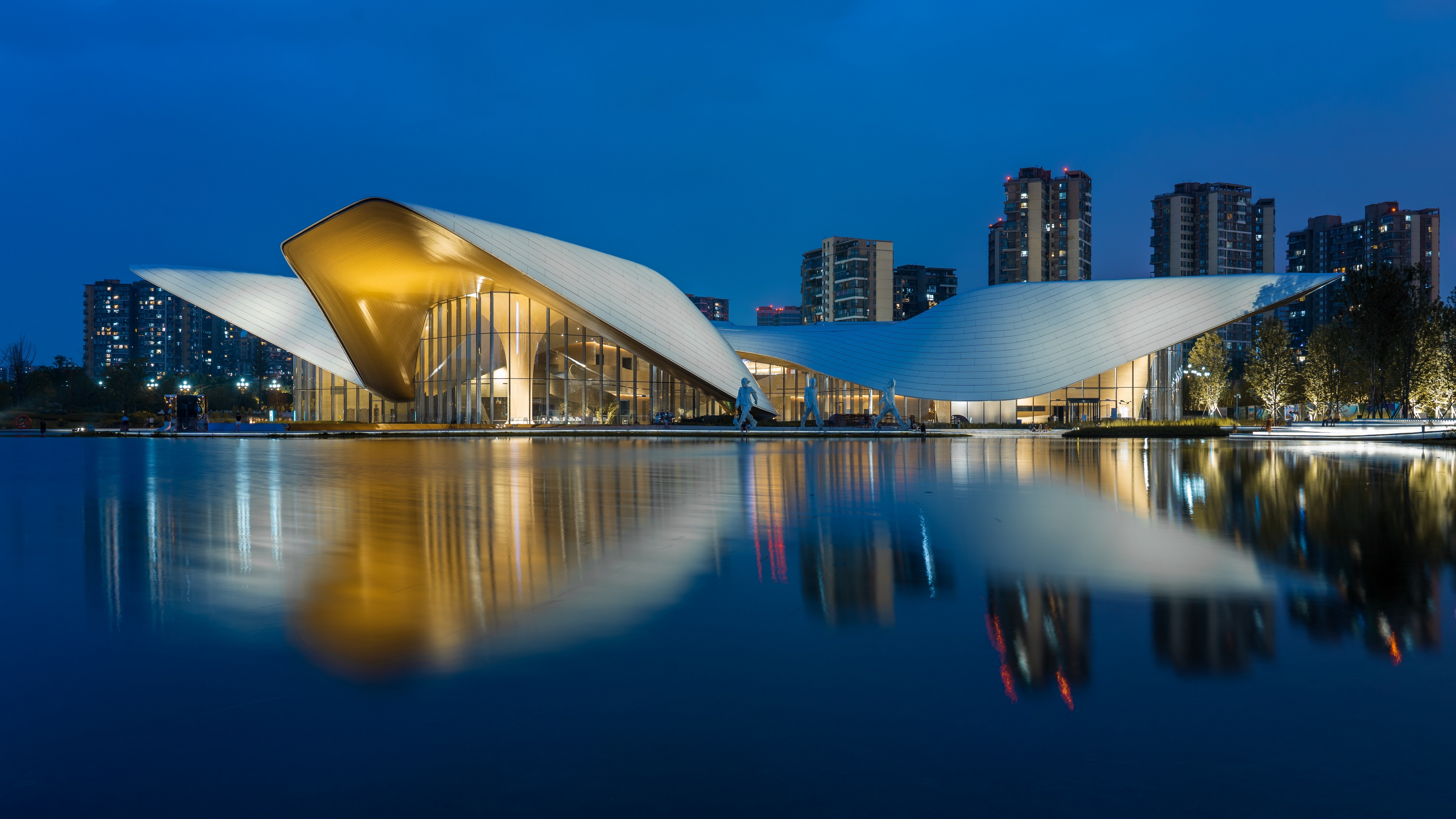 Description: A large building with a large body of water in front of it at night time with buildings in the background.