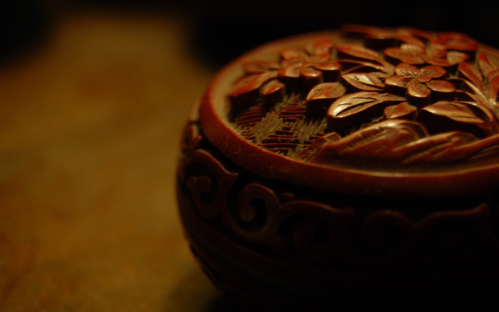 Description: A close up of a decorative wooden box on a table top with a flower design on it's lid.