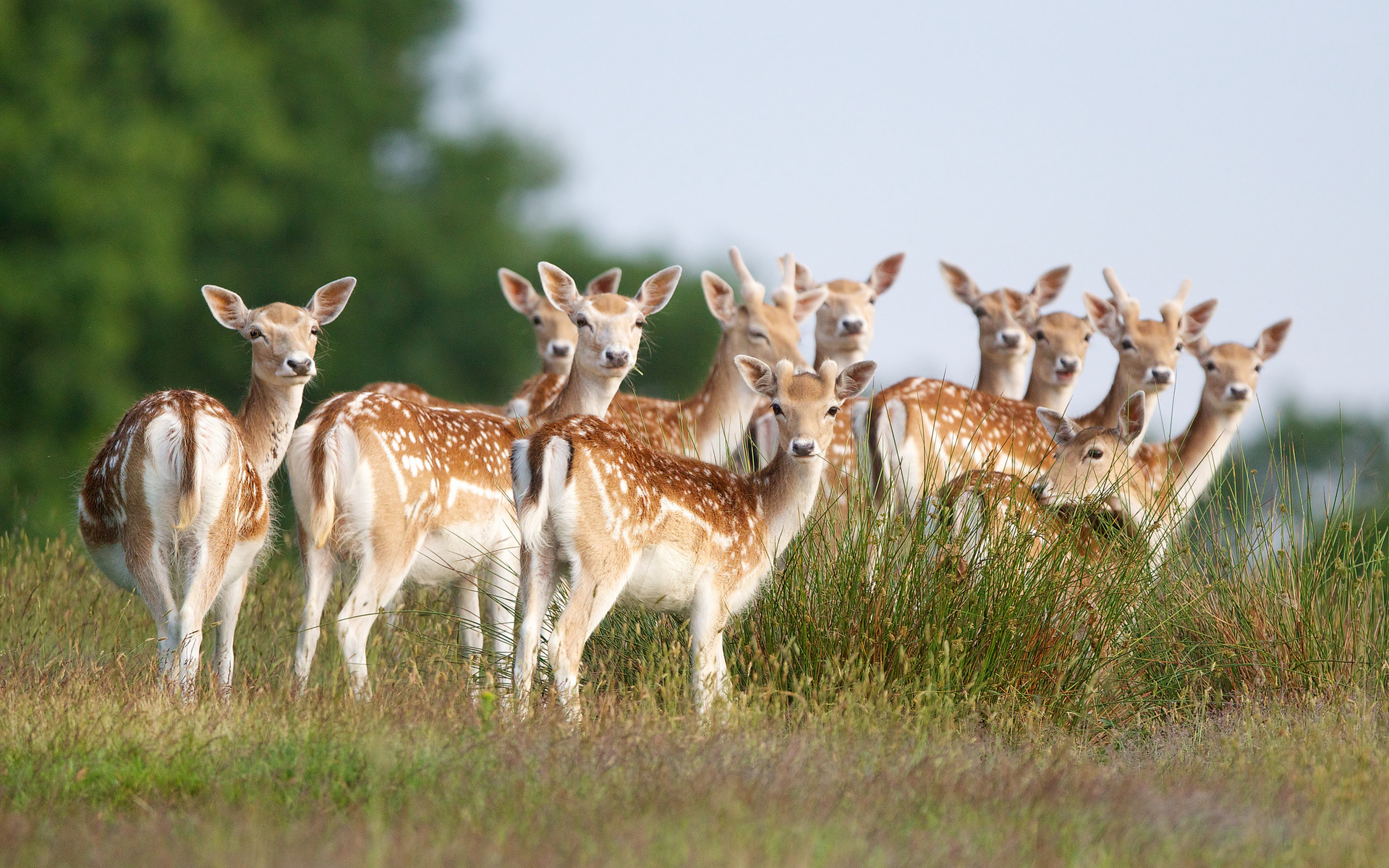 Description: A herd of deer standing on top of a grass covered field next to a forest filled with trees and tall grass.