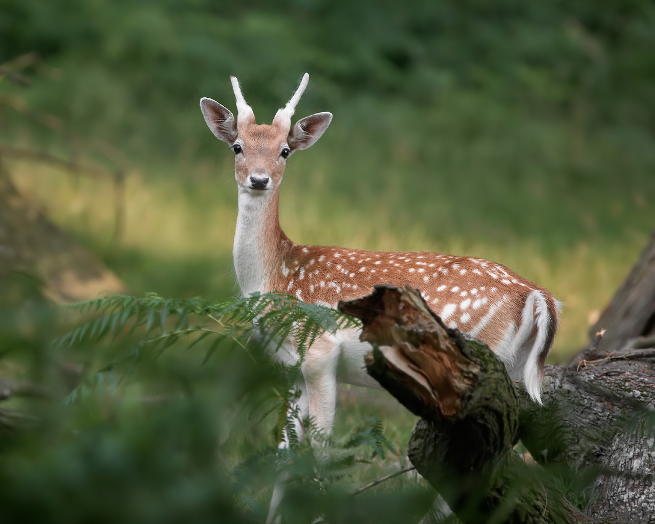 Description: A deer standing in a forest next to a tree branch and a log with a deer's head sticking out of it.