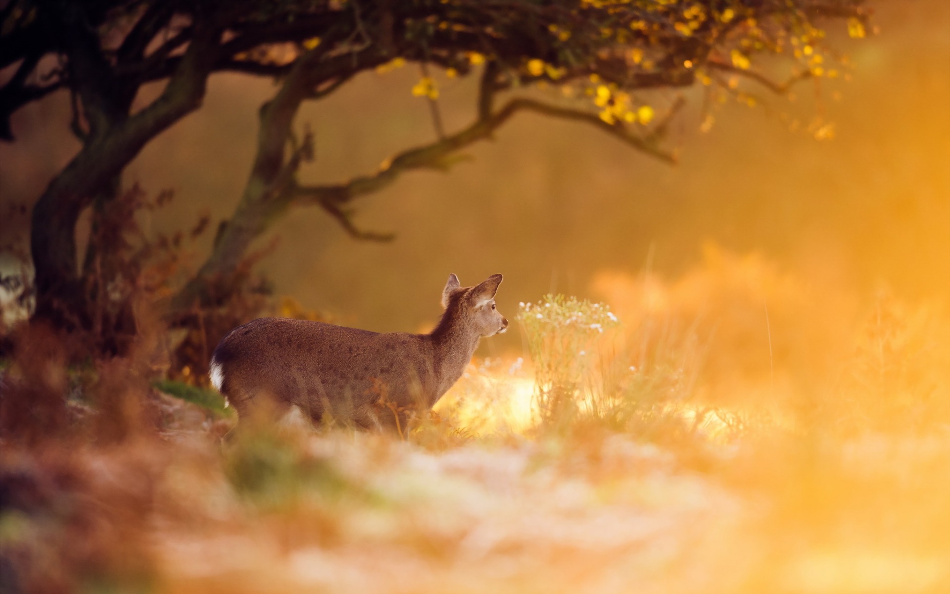 Description: A deer standing in the grass near a tree and bushes with yellow flowers in the background and a sunbeam.