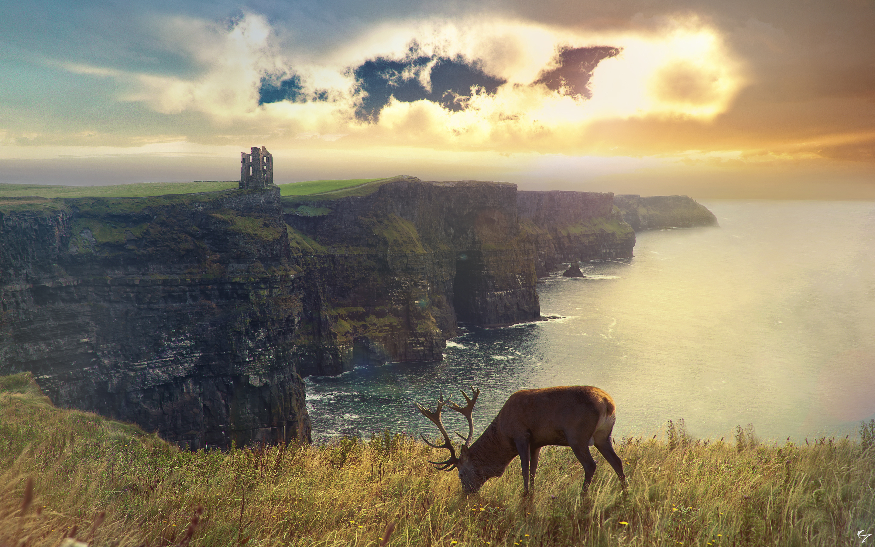 Description: A deer grazing on a grassy hill next to a cliff face with a castle in the background and a rainbow in the sky.