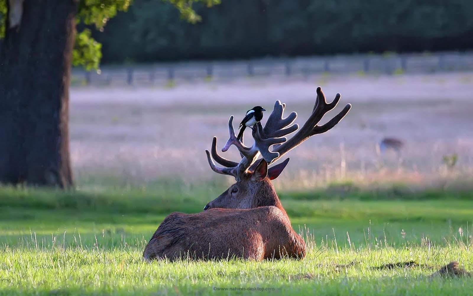 Description: A deer laying down in a field with antlers on its head and antlers on its back.