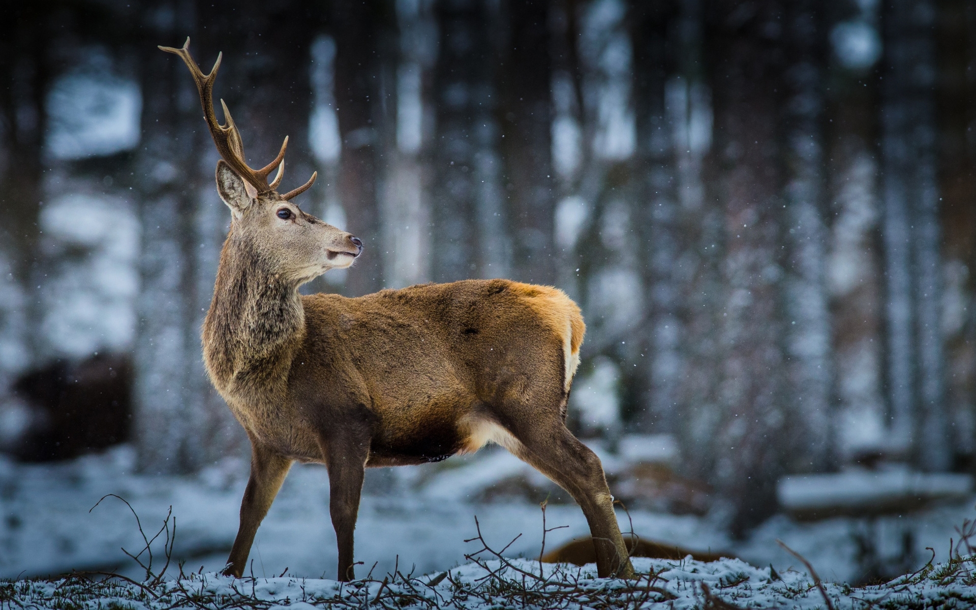 Description: A deer standing in the snow in a forest with trees in the background and snow falling on the ground.