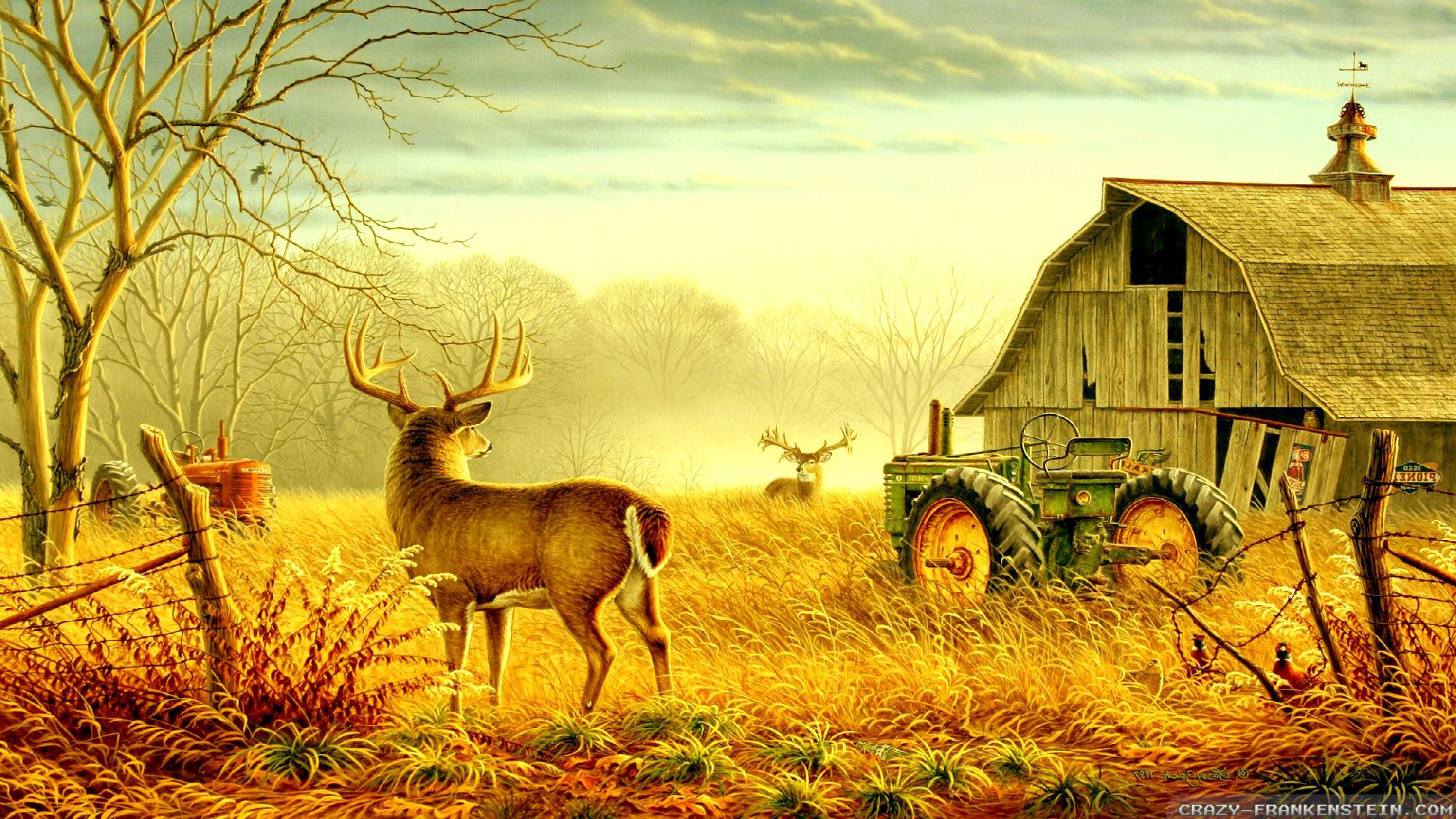 Description: A painting of a deer and a tractor in a field with a barn in the background and a tree in the foreground.