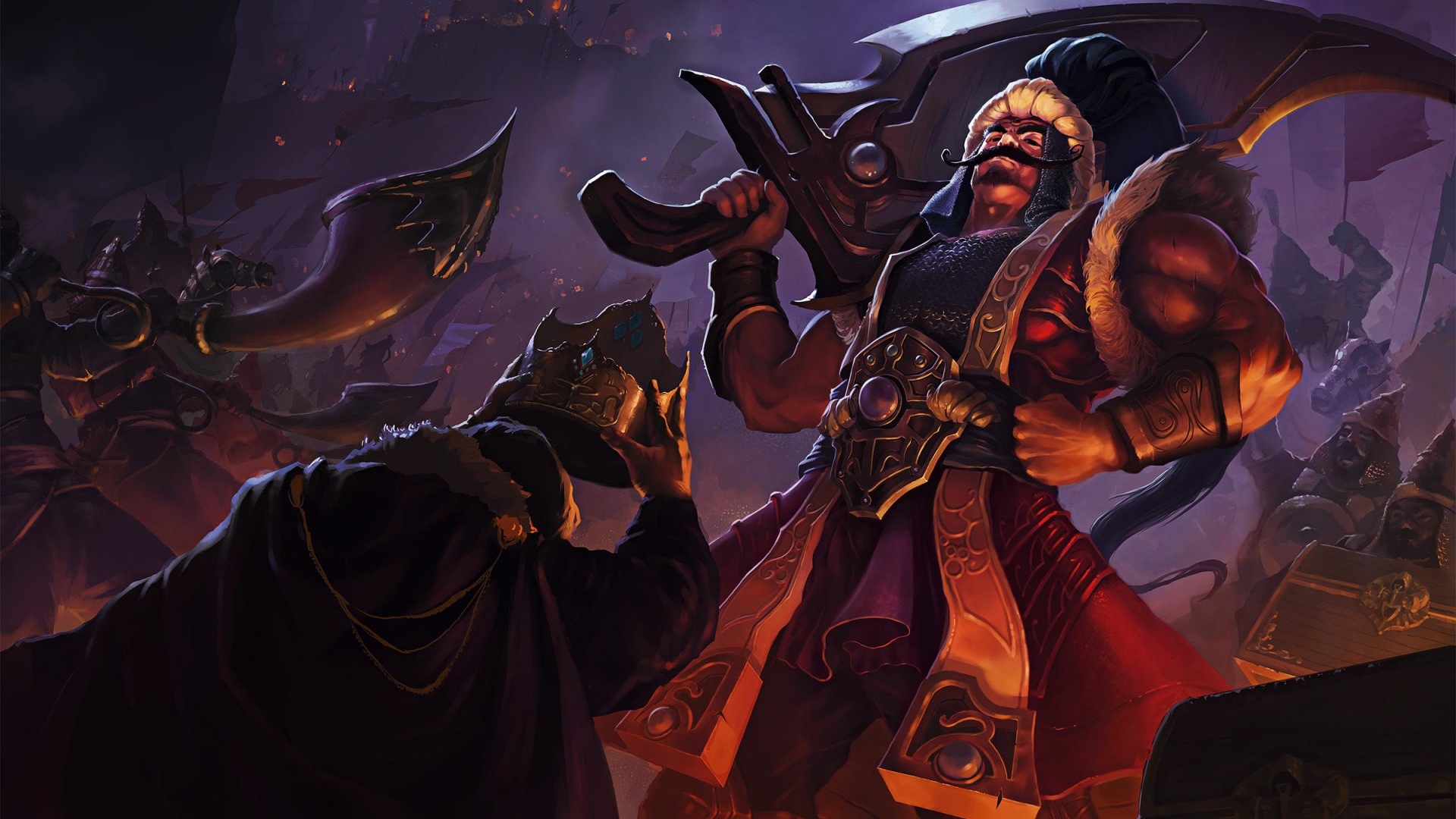 Description: A man in a costume holding a giant knife and a giant axe in his hand.