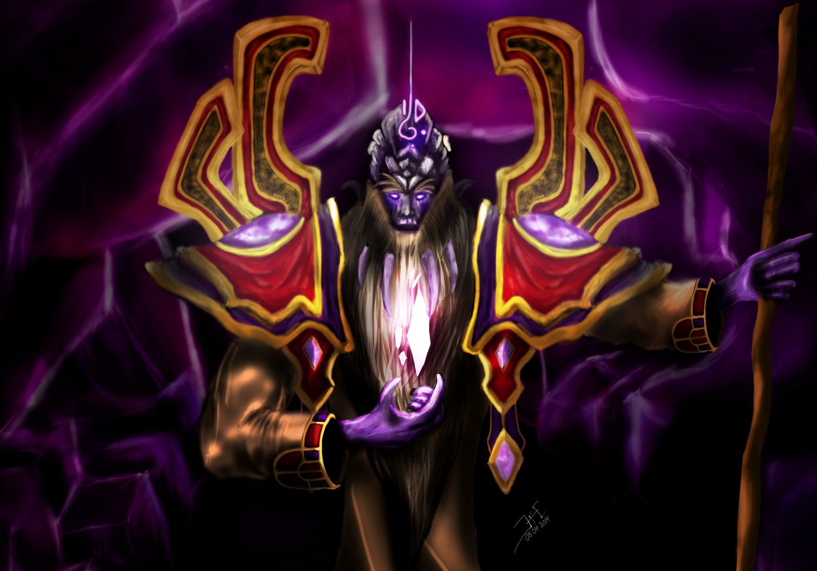 Description: A digital painting of a demon holding a staff and a glowing orb in his hands.
