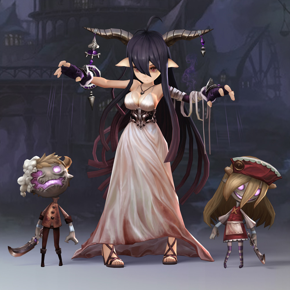 Description: A woman in a dress with horns and a demon mask on.