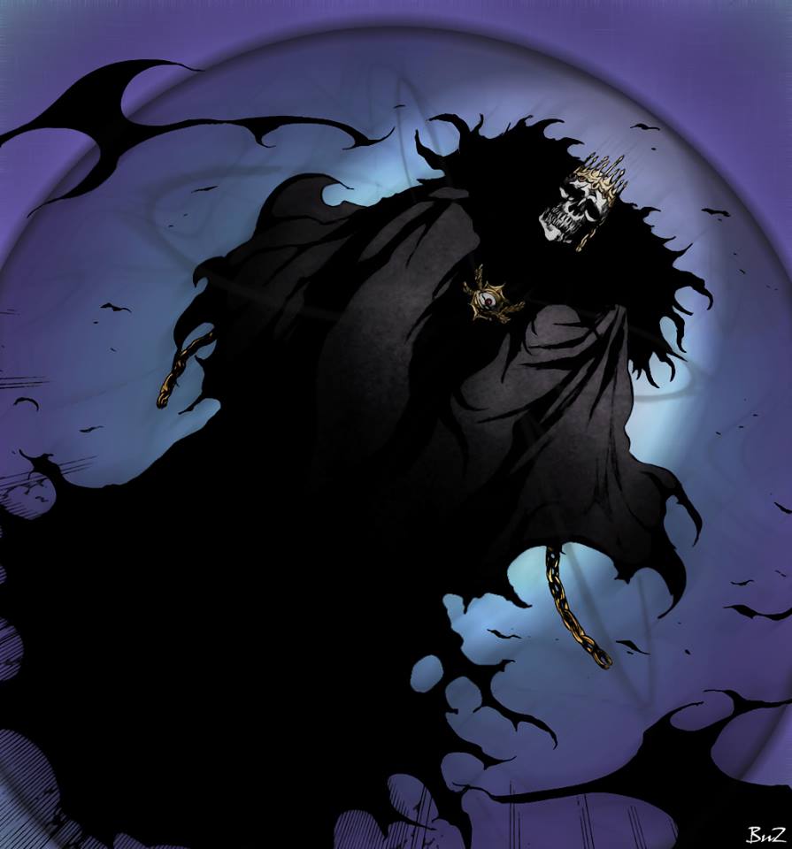 Description: A drawing of a demon with a skull on his head and a crown on his head.
