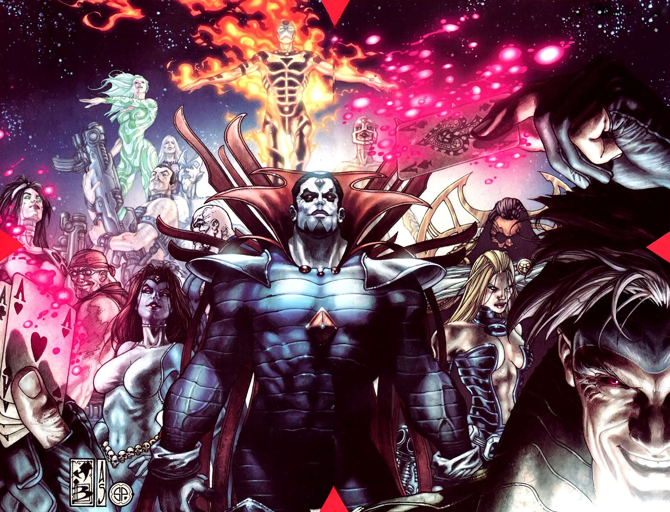 Description: A group of people standing around each other in front of a poster of a demon with a skull on it.