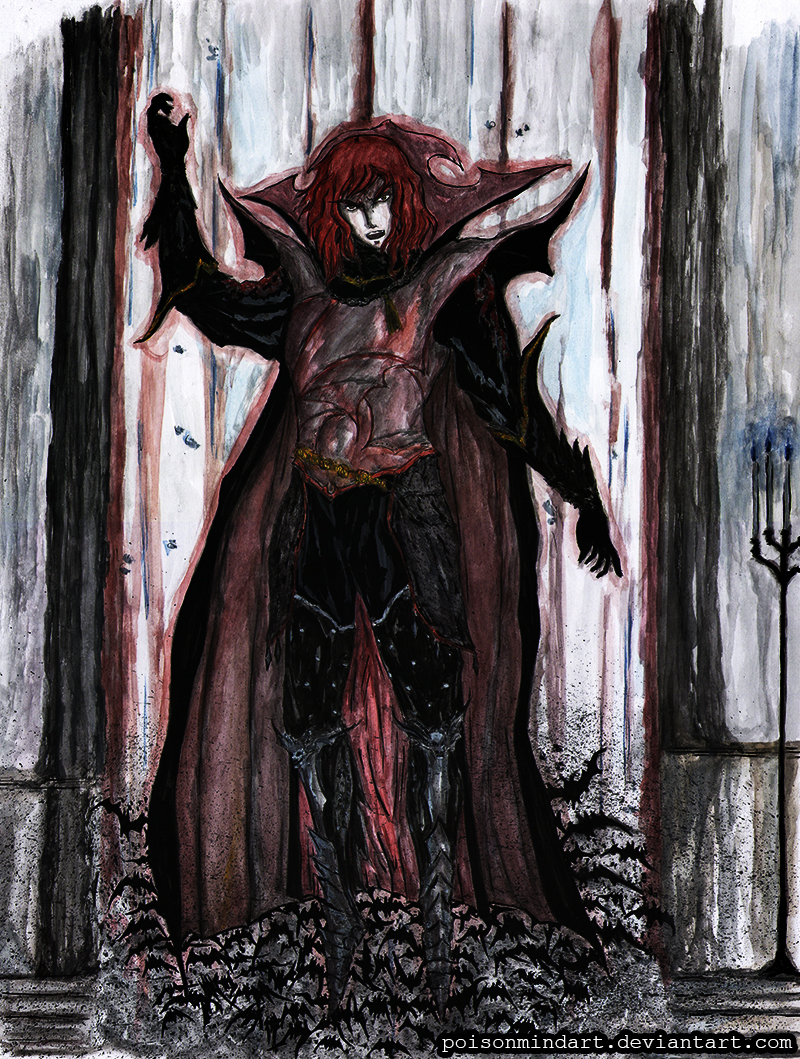 Description: A drawing of a demon standing in a doorway with his arms outstretched and hands in the air.