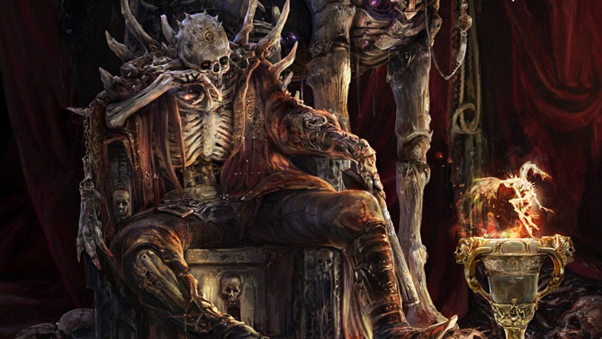 Description: A demonic looking chair with a candle in it and a demonic looking statue in the background with a candle in the middle.