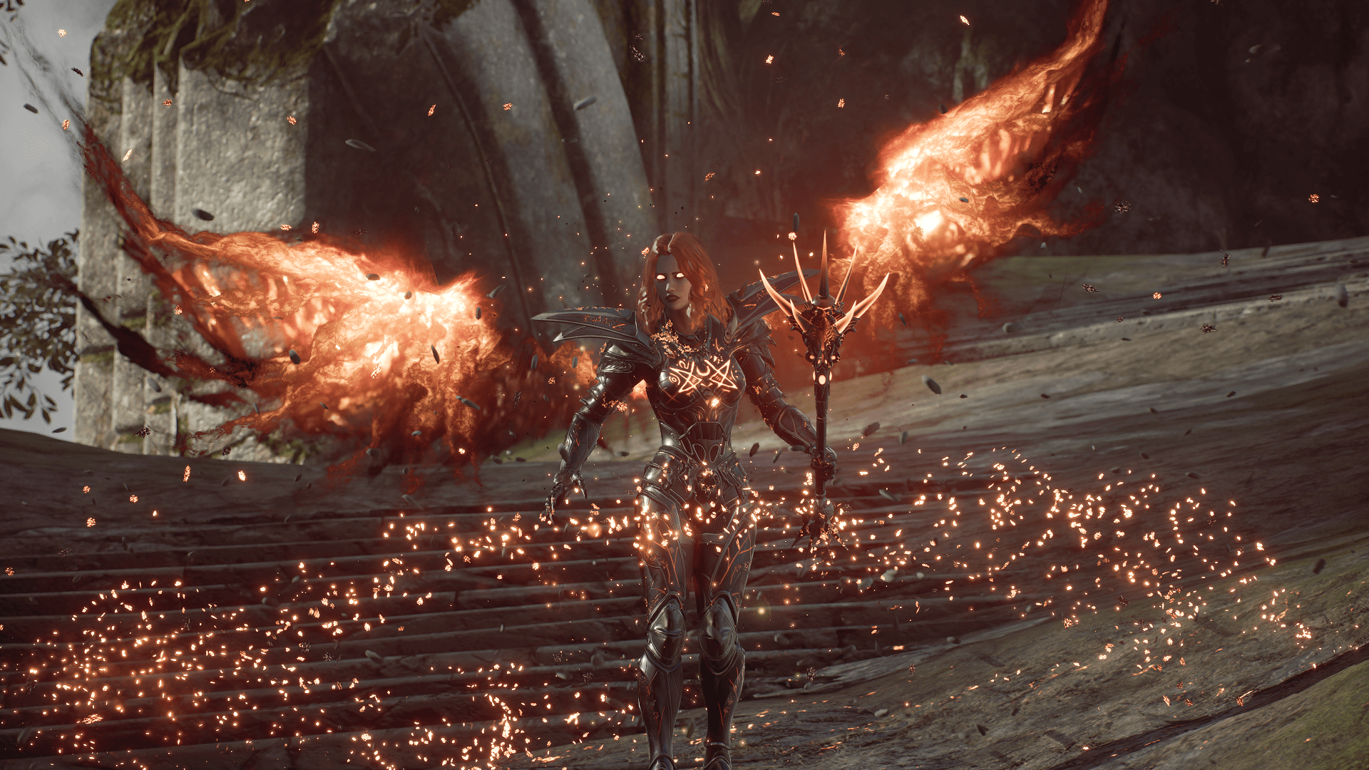 Description: A demonic looking creature with fire in its hands and wings outstretched in a forest setting with a large amount of fire.