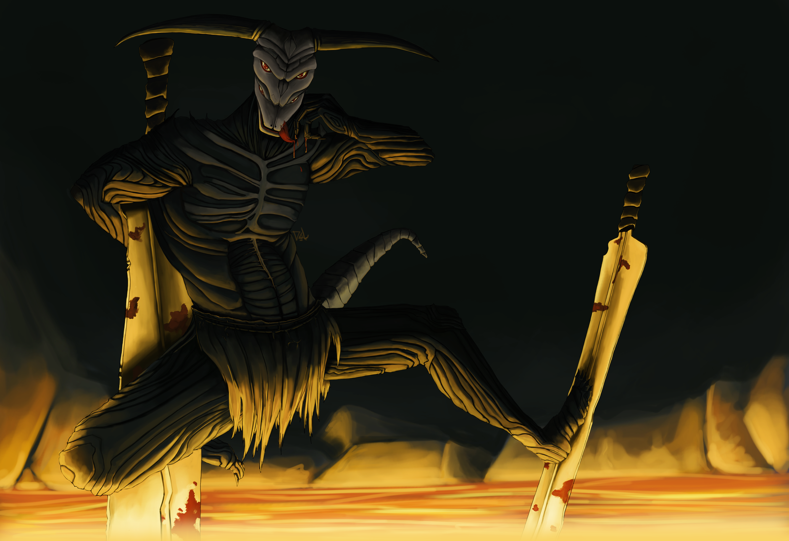Description: A demonic looking creature with two swords in his hand and a demon on his back.