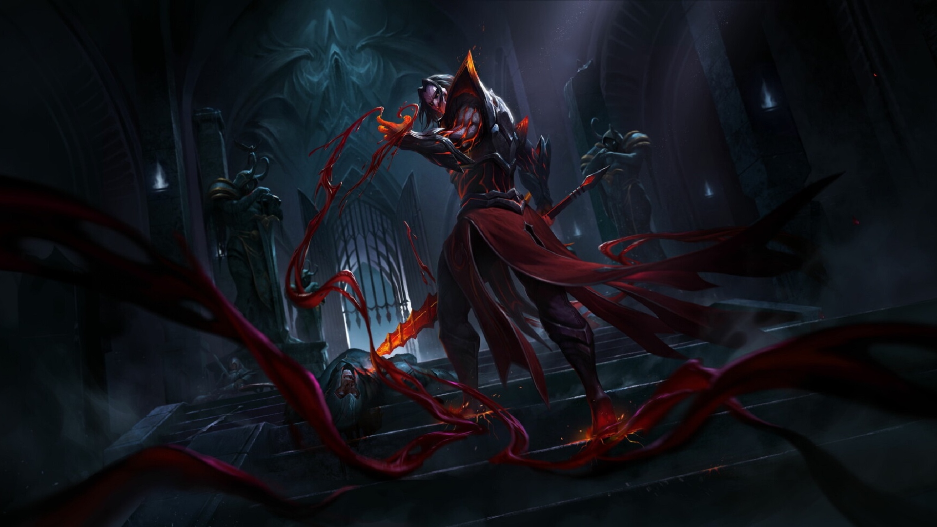 Description: A demonic demon with a sword and a blood robe on a dark background with a demon in the middle.