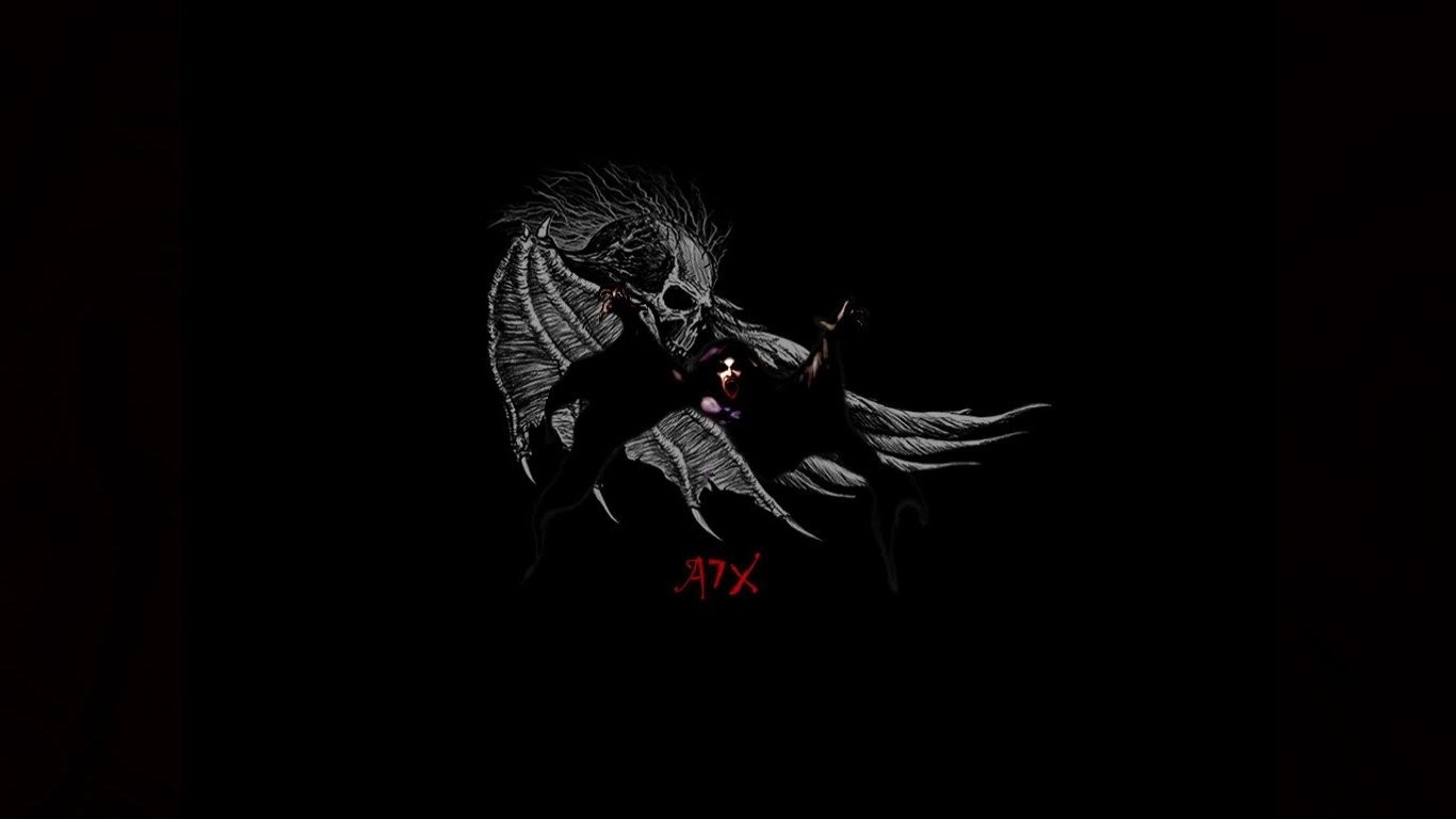 Description: A demonic demon with a sword in the dark with a blood stain on it's face and wings.