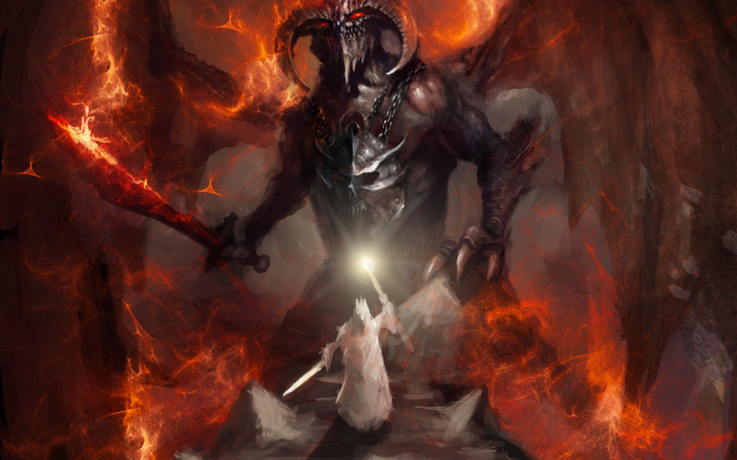 Description: A demonic demon with a sword in his hand and a demon on his back with flames around him and a light in his hand.