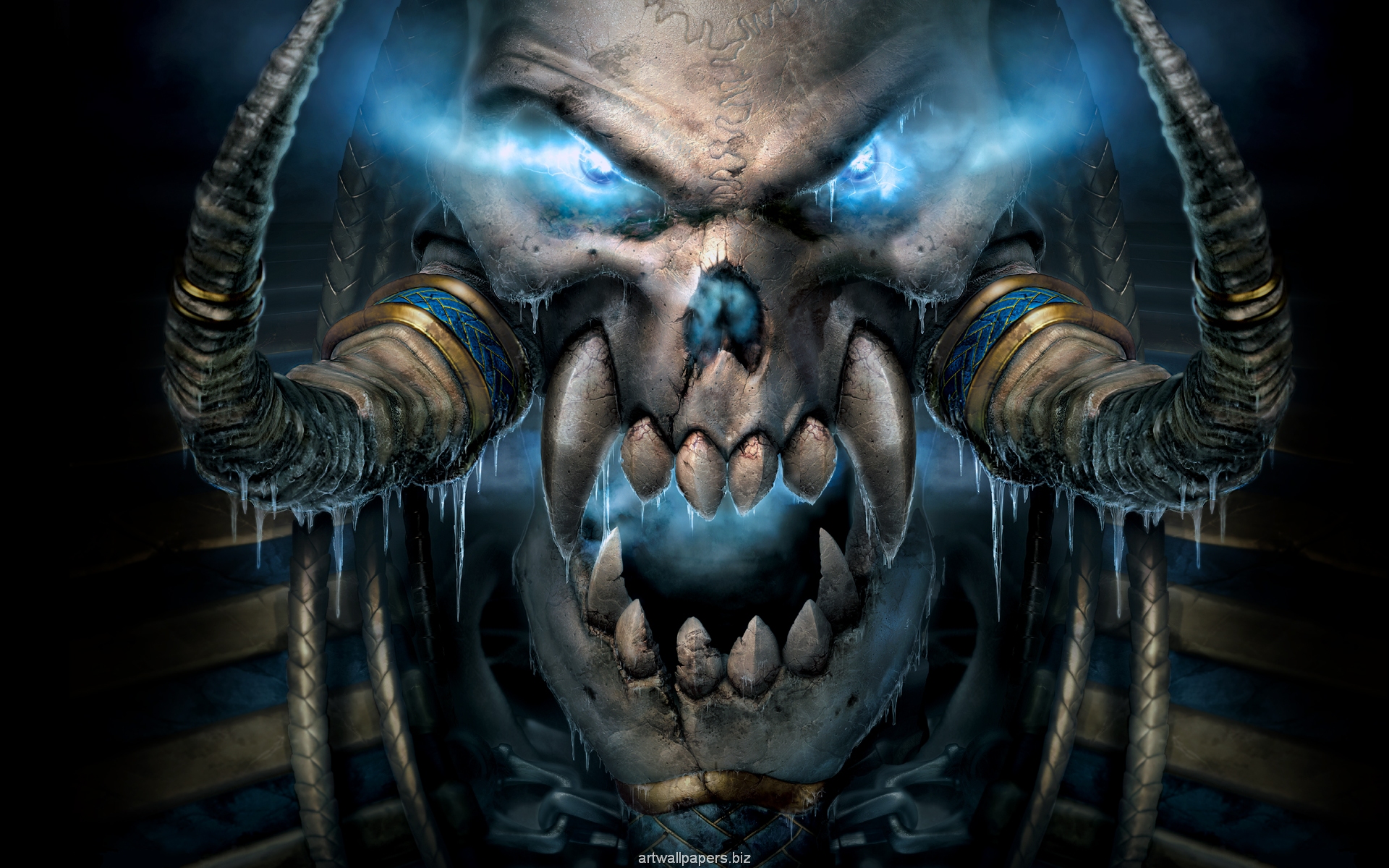 Description: A demonic looking face with blue eyes and horns on it's head.