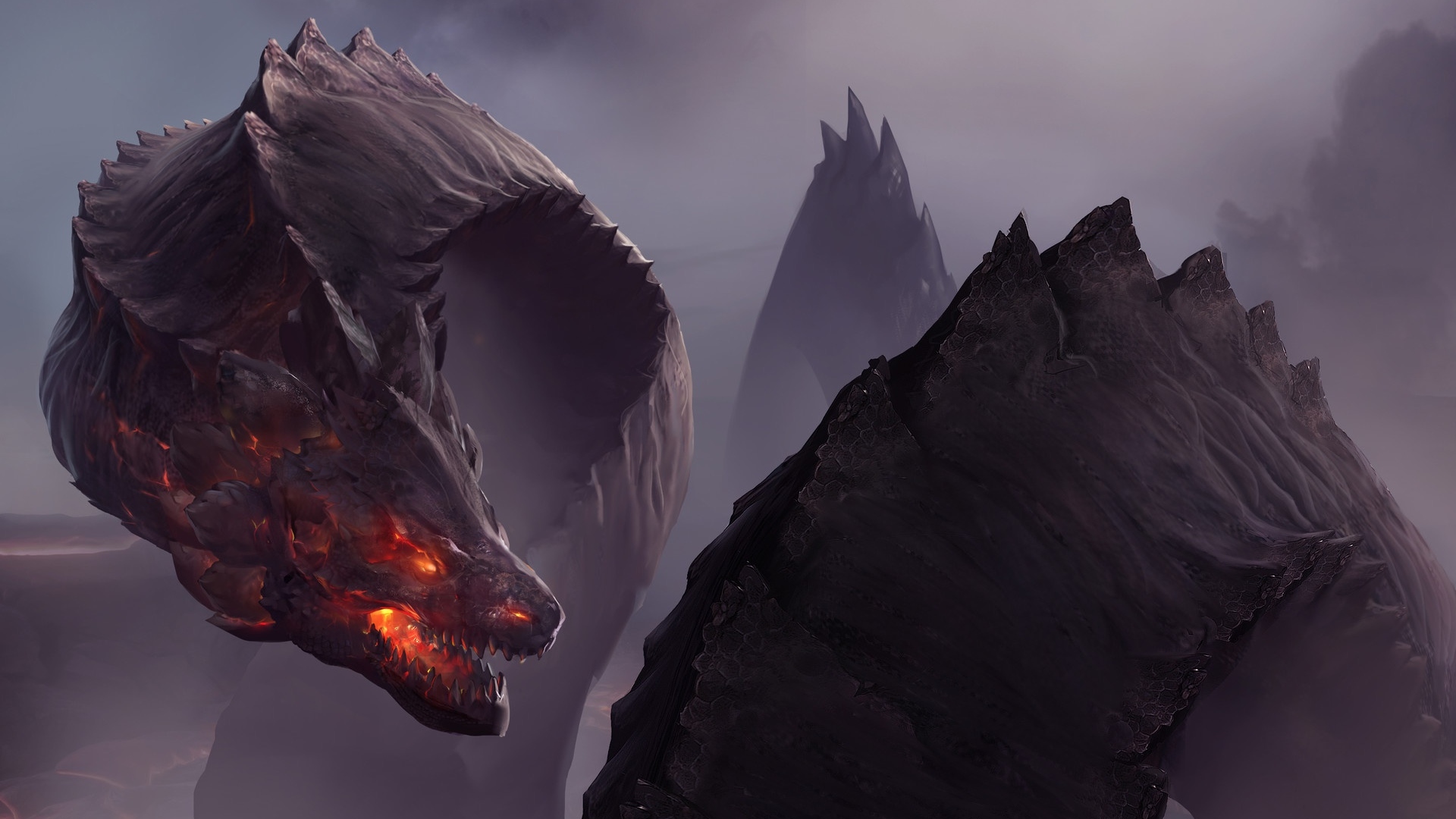 Description: A demonic looking creature with a glowing face and a huge head on a mountain side in a foggy landscape.
